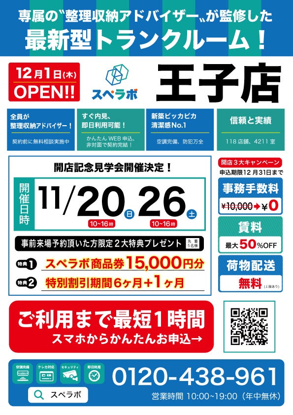 【12月1日(木)オープン】見学から契約、解約まで完全非接触・非対面、お申し込みからご利用まで最短1時間!都内、大阪などにて絶賛運営中のトランクルーム【スペラボ】が北区王子駅近くに出店!