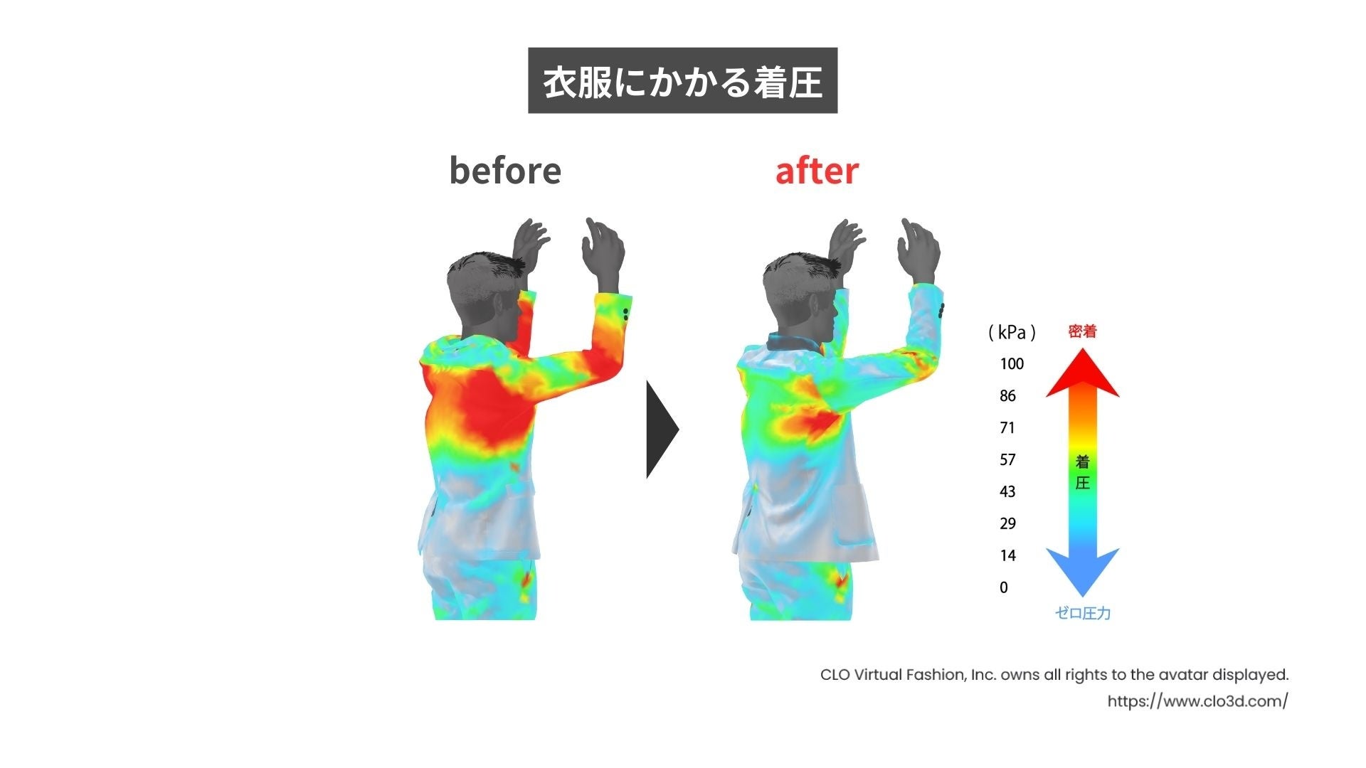 ジャケットを着用した際、つり革を掴むなどの腕を上げる動作で負荷を感じやすい腕回りを3Dデジタル検証し、最適なパターン設計で着圧を軽減させました。