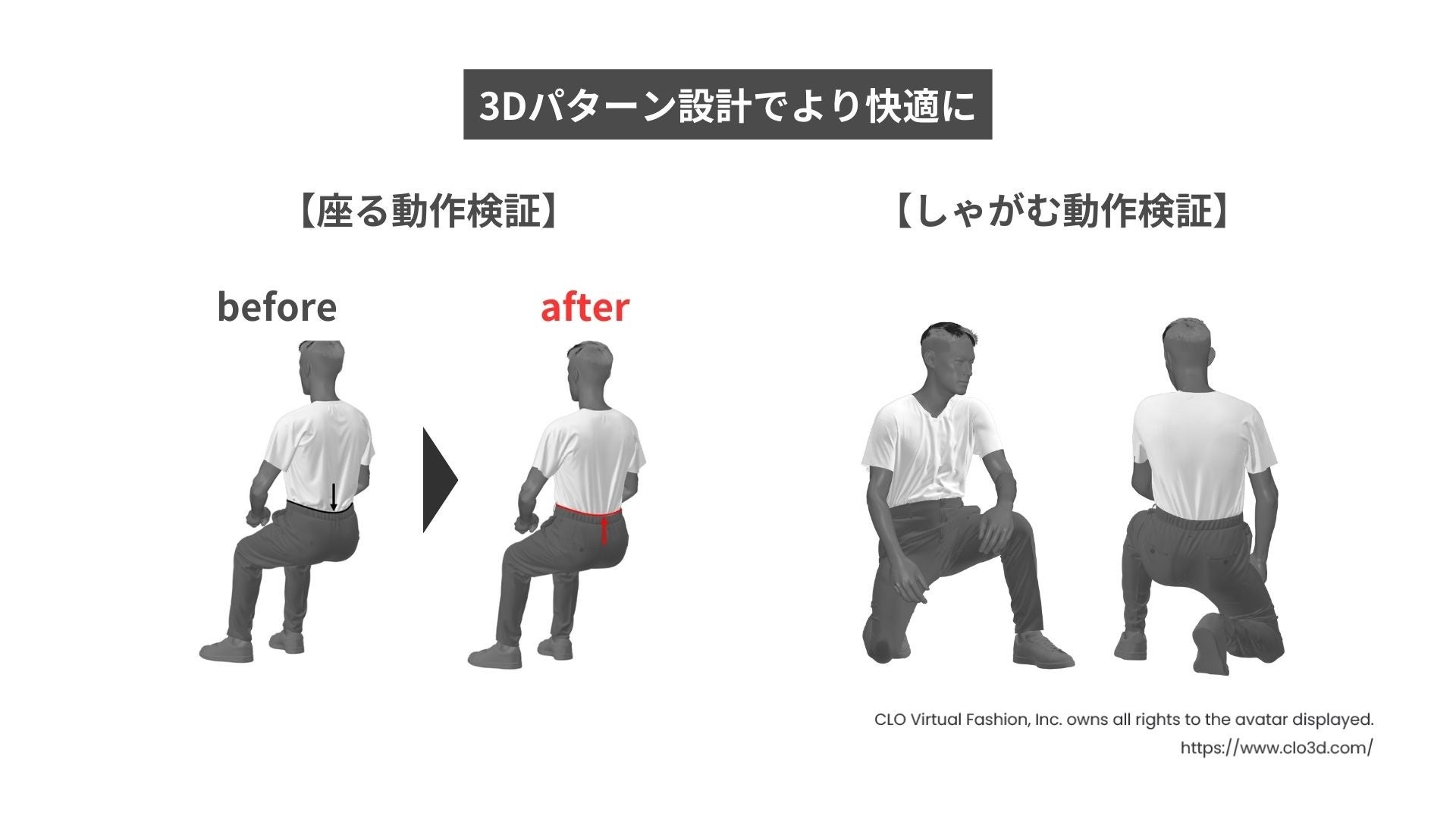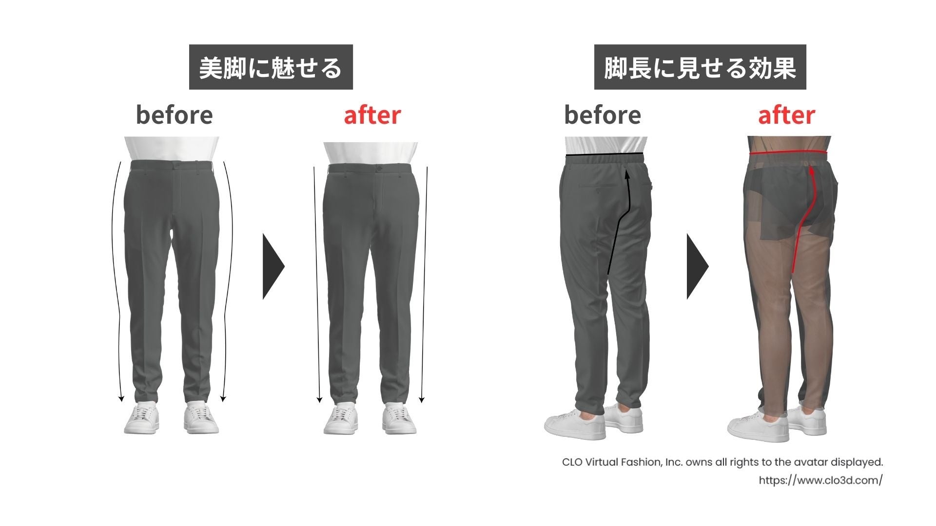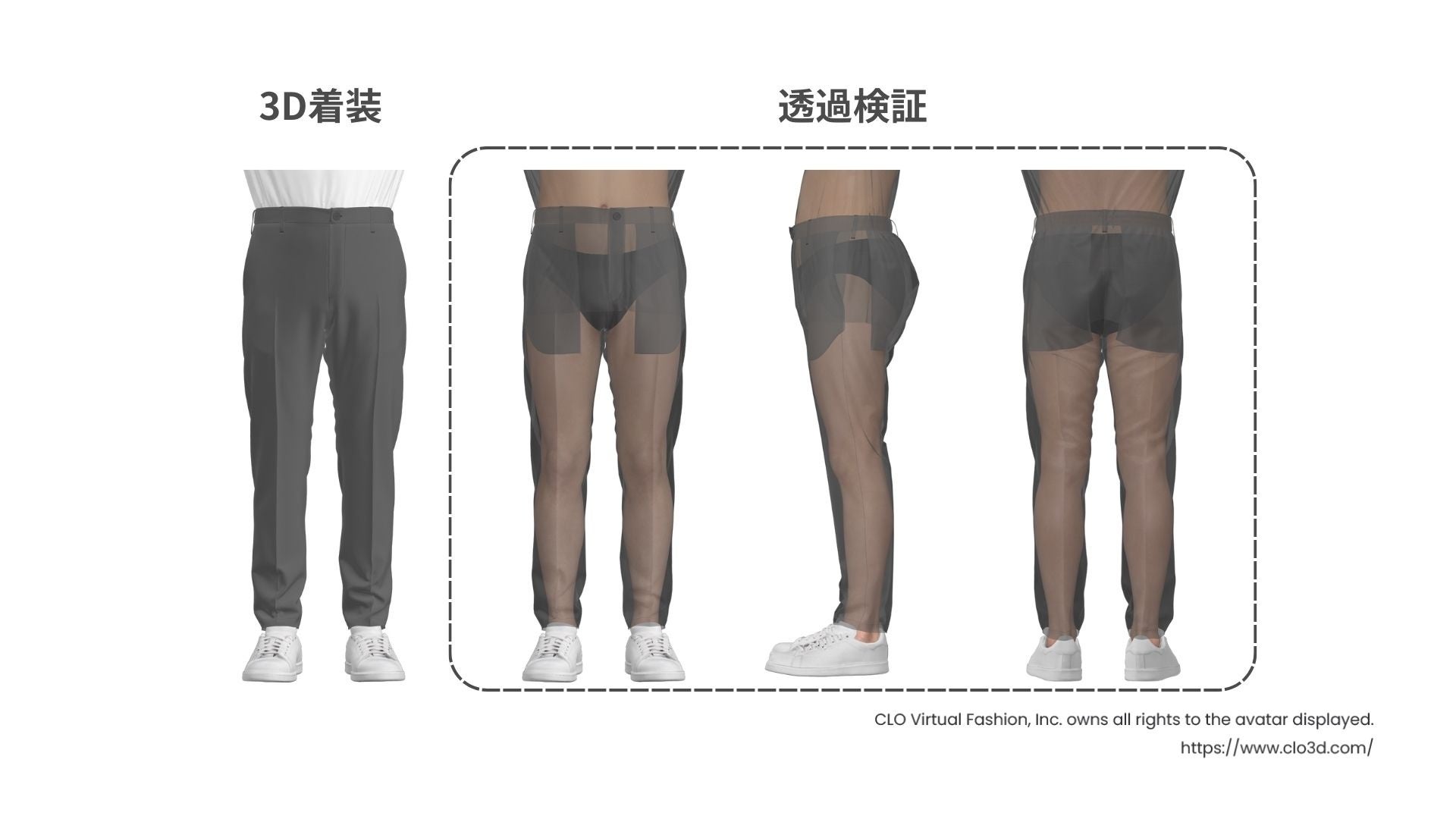 アバターの透過検証を活用し足回りの無駄な空間をうまないことで、スタイリッシュな見た目とフィット感を追求しました。また立体設計にすることでヒップが上がって見えるシルエットになり、脚長に見える効果があります。