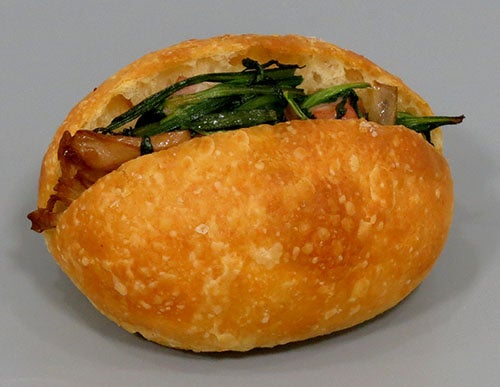 商品説明:旨みを引き出した西阪農園の“泉州きくな”を塩ガーリック炒めにして、フォカッチャにサンド。