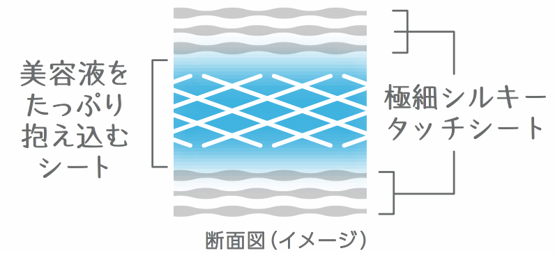 美容液をたっぷり抱え込むシートを、シルクのようなやわらかシートでサンドした3層構造のマスクです。100%天然由来素材のやさしい使い心地です。