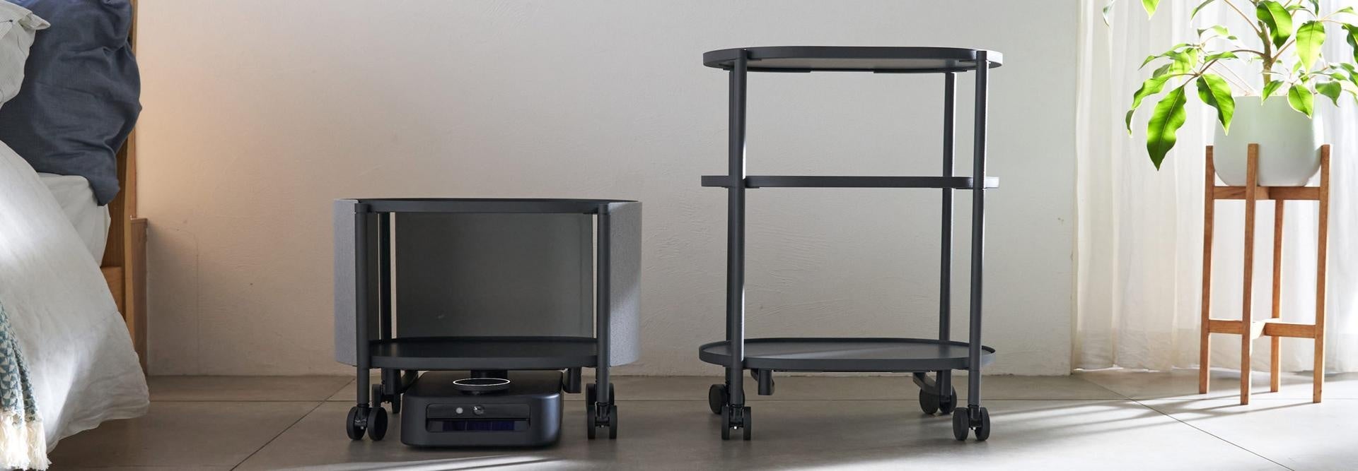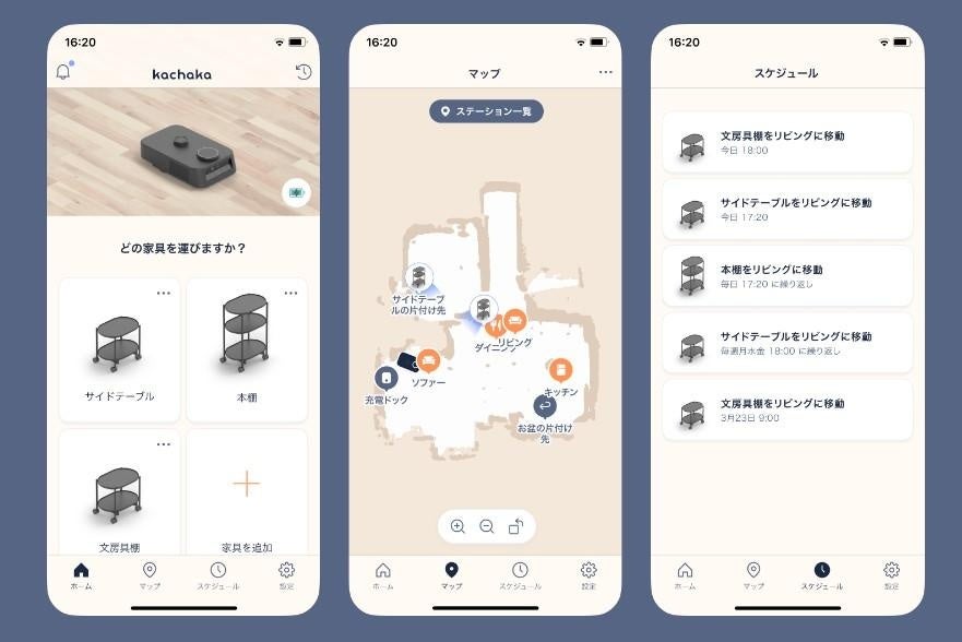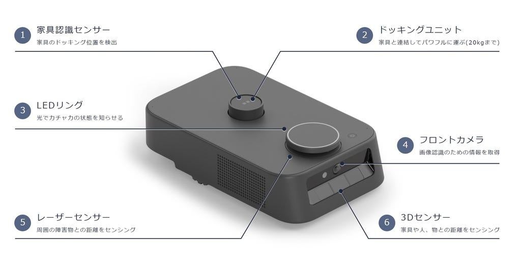 「カチャカ」は、人の声や専用アプリの指示に従い、別売りの「カチャカファニチャー」(カチャカシェルフ2段または3段・カチャカベース)をドッキングして室内の様々な障害物を避け指定された場所まで移動。「カチャカシェルフ」を含め20kgのペイロードがあります。