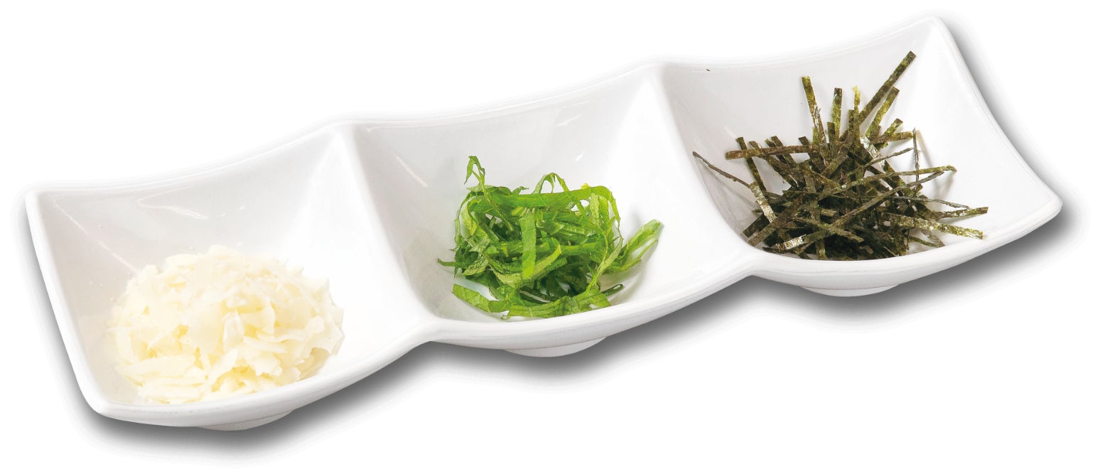 トッピングはパルメザンチーズ、大葉、海苔の3種類。和テイストが好きな方におすすめです。