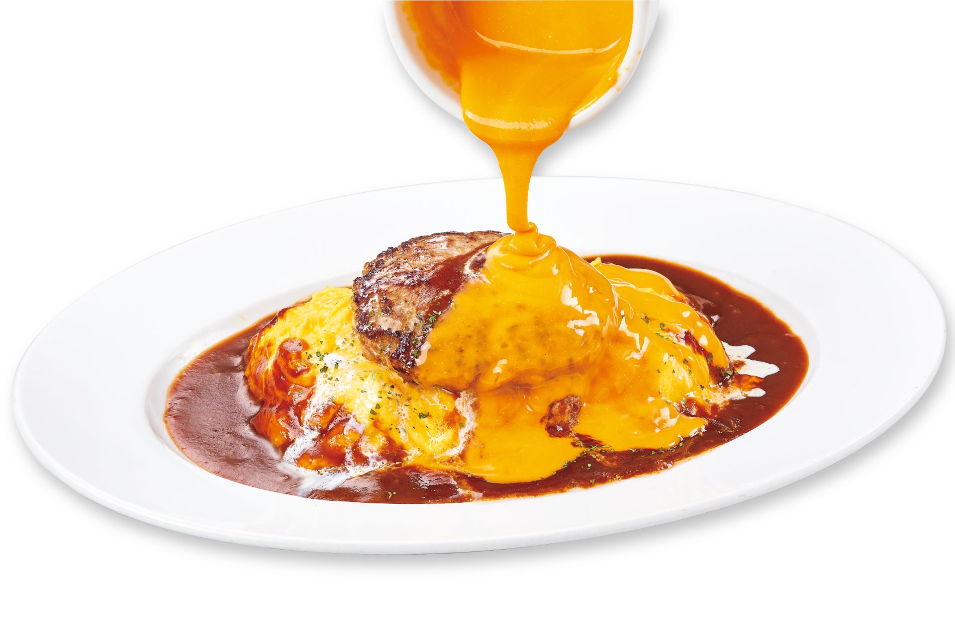 ・“ネオ”ハンバーグオムライス~かけるチェダーソース~(税込1,429円)