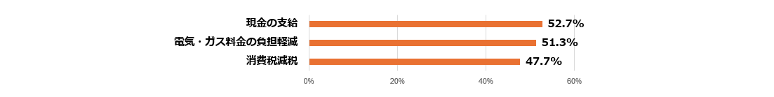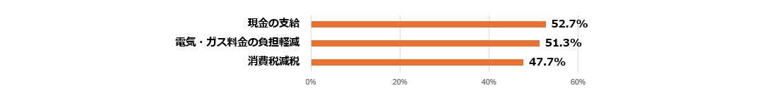 - 求める対策上位は現金支給52%、電気ガス代減51%、消費税減税47% -