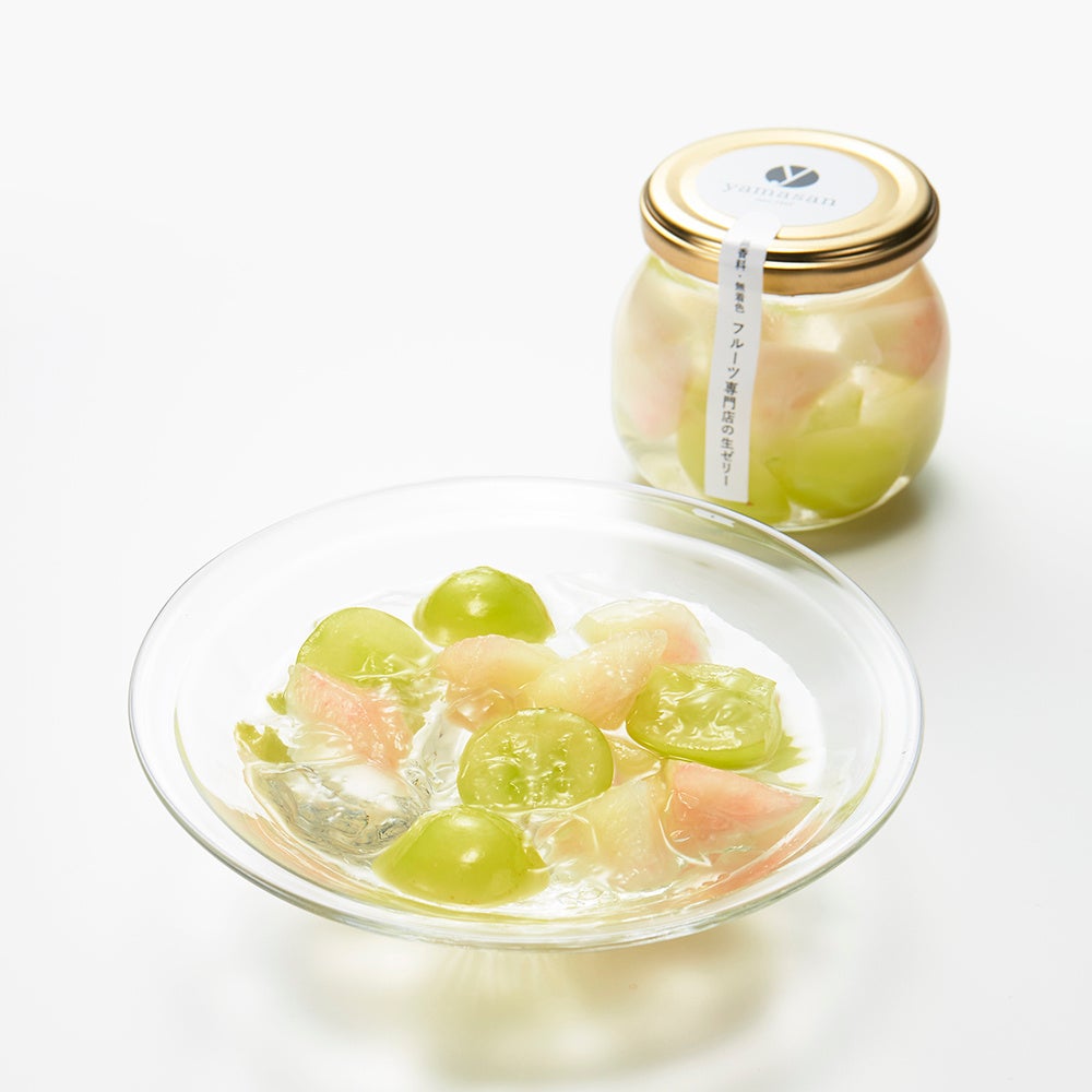 フルーツ専門店より、福島県産の厳選された高糖度の桃と、歯ごたえのよいシャインマスカットが入った、とびきりフレッシュなゼリー。