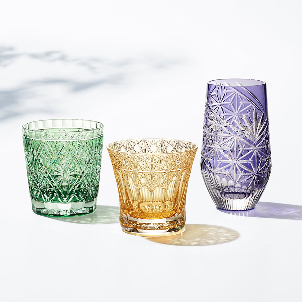 伝統工芸士、篠崎英明氏がデザインとカットを施した江戸切子のロックグラスとタンブラー。繊細に表現された和の伝統模様と豊かな色彩をお楽しみください。