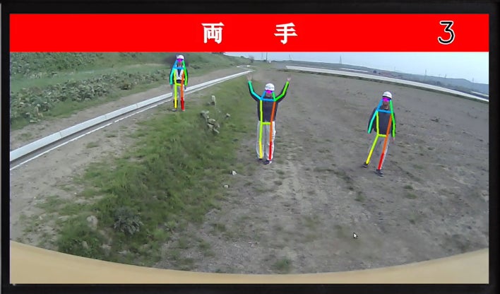 ③ AIカメラが人物を検知するだけでなく、片手を挙げた場合は「注意」、両手を挙げた場合は「警告」と、指示者のジェスチャー(=姿勢)を判定し、モニター表示とブザー音でオペレーターに伝達