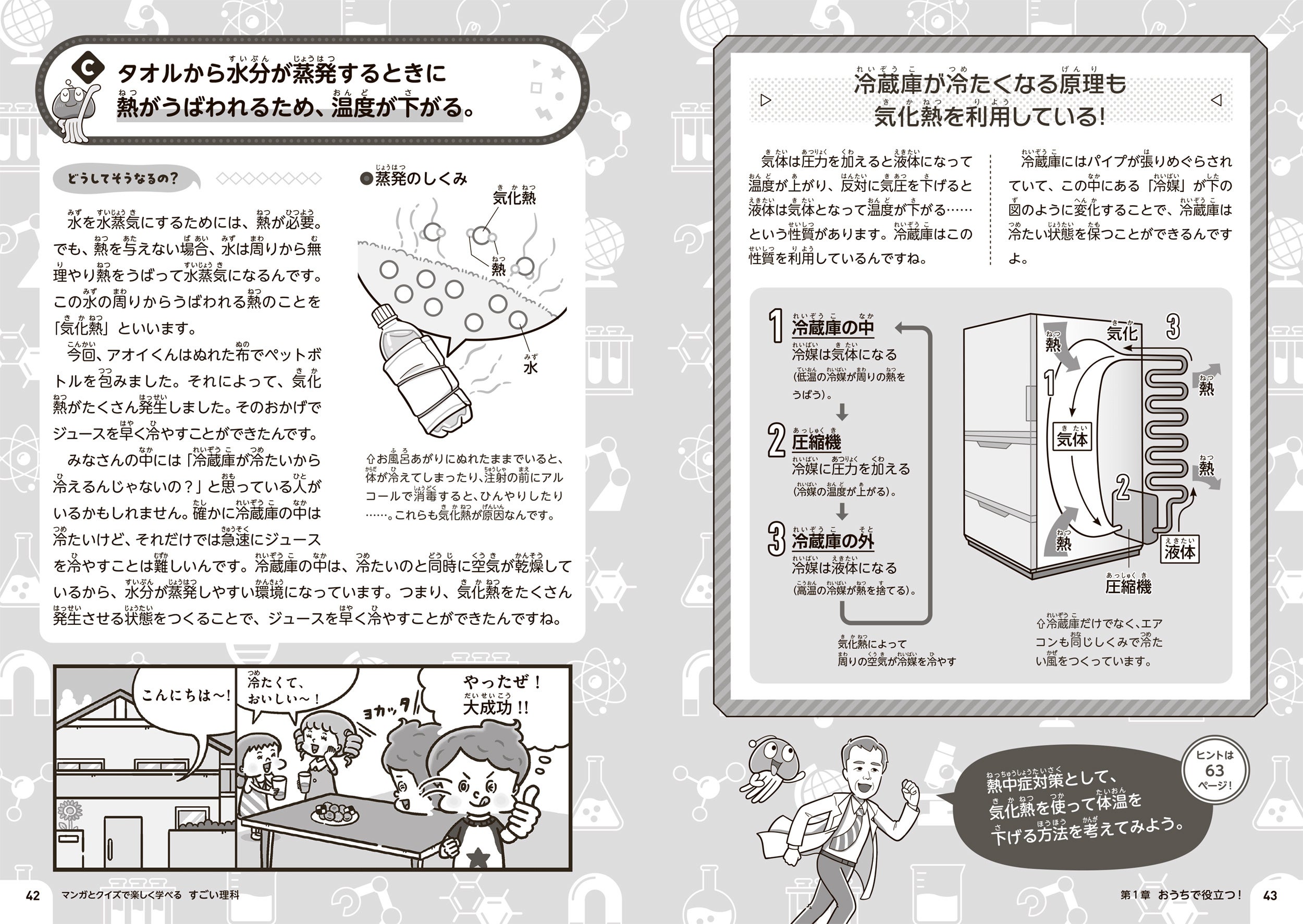 本書では、日常のお困りごとやサバイバルを50のミッションにしています。ミッションごとに、マンガを読んで、クイズを解いて、理解を深めるという構成になっているので、楽しく読んでいるうちに理科の知識を身につけられます。