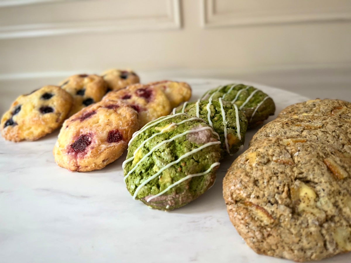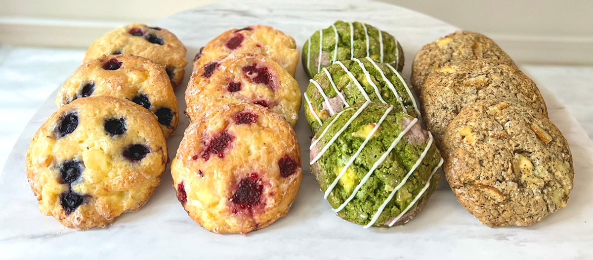 一般的に知られている筒型の「イングリッシュスコーン」とは違って、クリームチーズをたっぷり入れた生地にフルーツなどの具材を混ぜ込んだ、ハワイで人気のスコーンです。