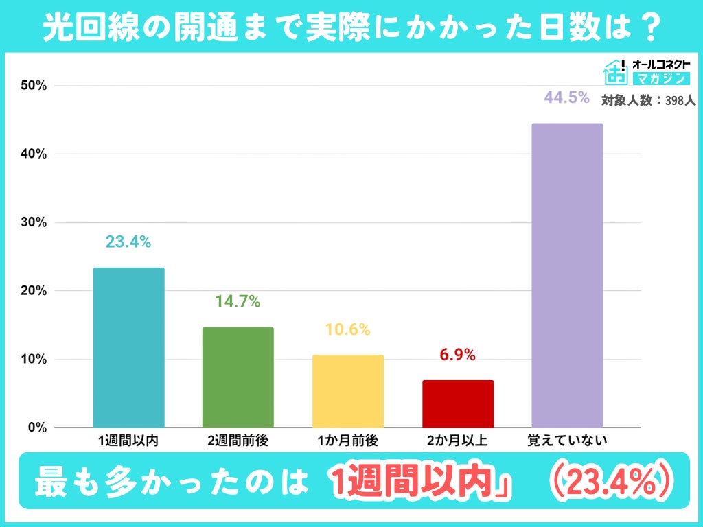 光回線を利用している人に開通までにかかった日数を聞くと、覚えている人の中で最も多かったのは「1週間以内」(23.4%)でした。