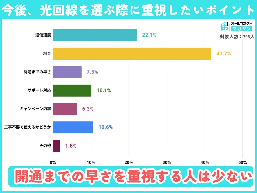 一方で光回線の「開通までの早さ」(7.5%)を重視している人は少ない傾向にあります。