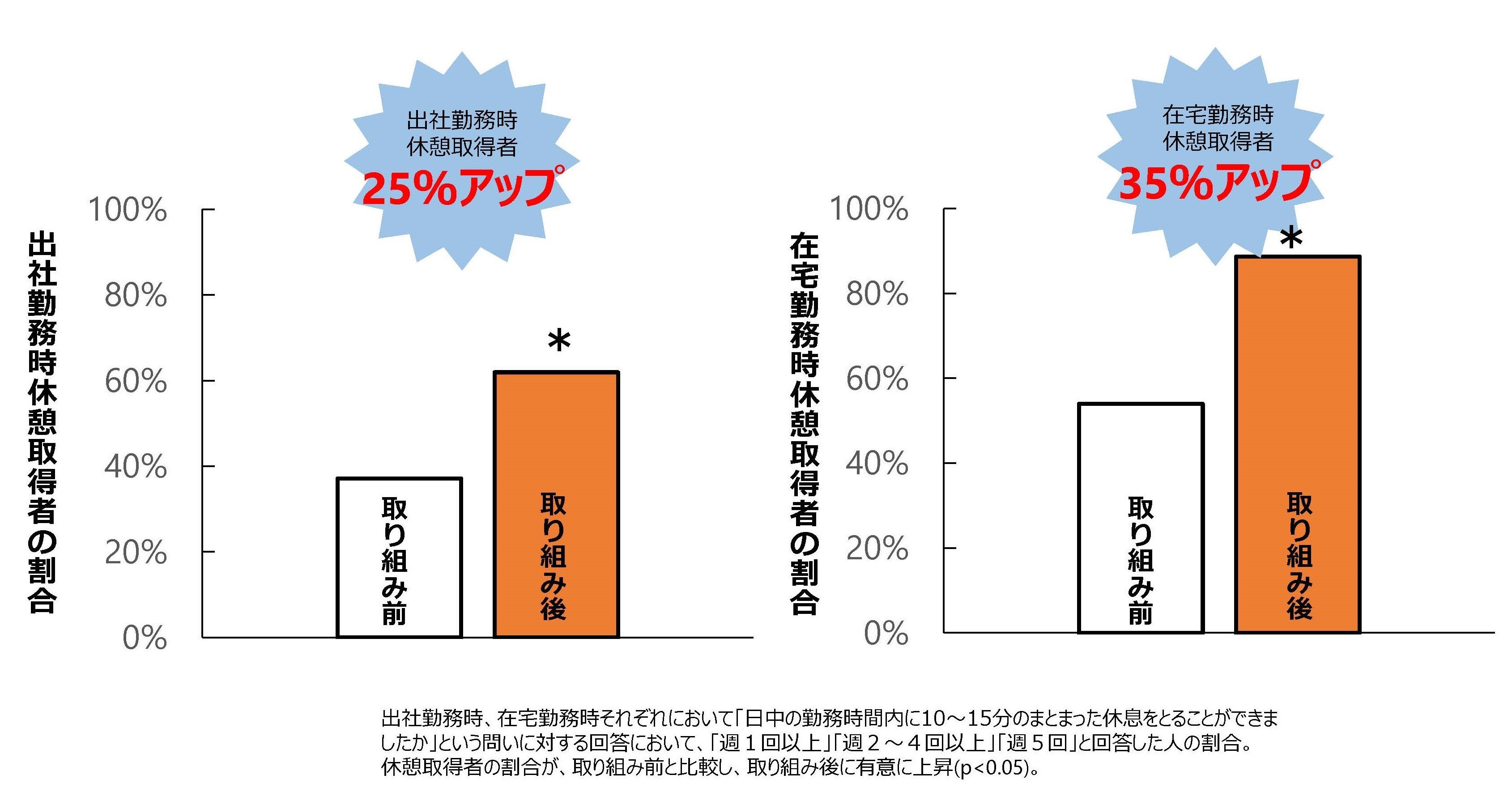 現在、花王では、新型コロナウイルス感染拡大防止の観点から、出社勤務と在宅勤務を併用したフレキシブルな就業体制を継続しています。今回、「日中の休息でGENKIチャレンジ」を実施したことにより、出社・在宅に関わらず日中の休息・休憩時間を確保できるようになった社員が増加しました。また、パフォーマンスおよびワークエンゲージメントの向上がみられることを確認し、本企画に参加した社員からは、「日中休むことがなかったので、リラックスして業務に取り組めた」「目を閉じる時間をつくり、スッキリできた」「午後からの集中力がアップした」など、積極的な「休み休みWork Style」を取り入れたことによる効果を実感した感想が寄せられました。
