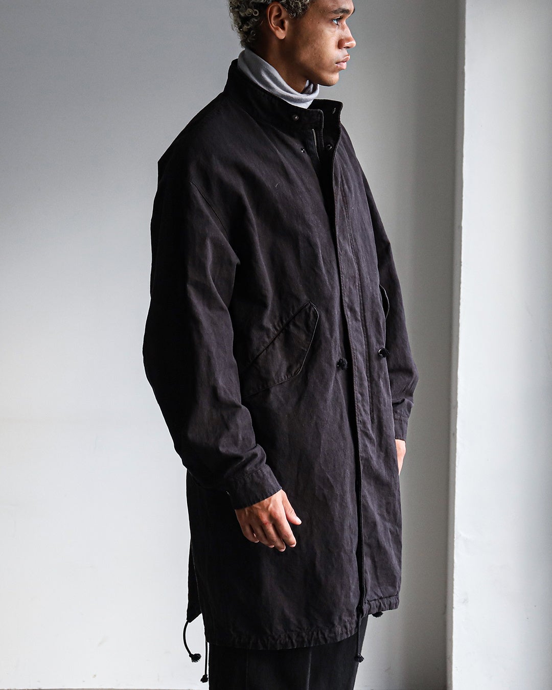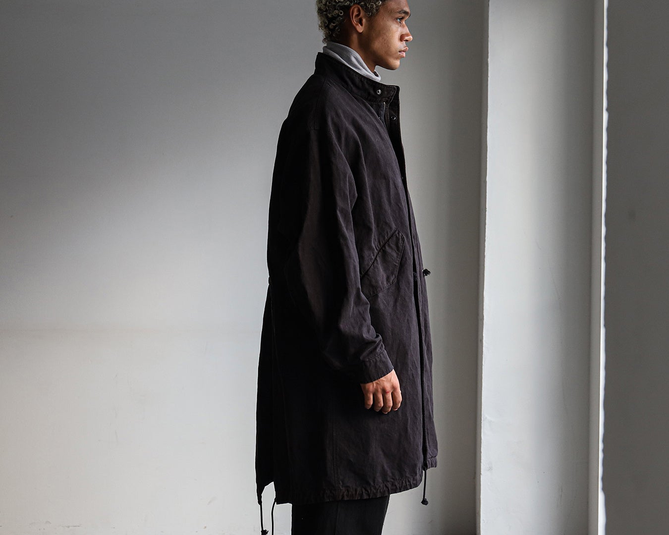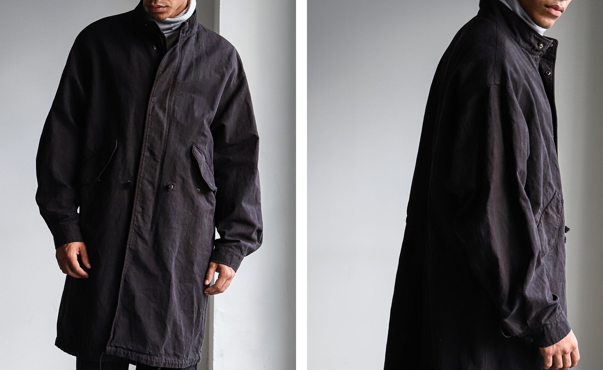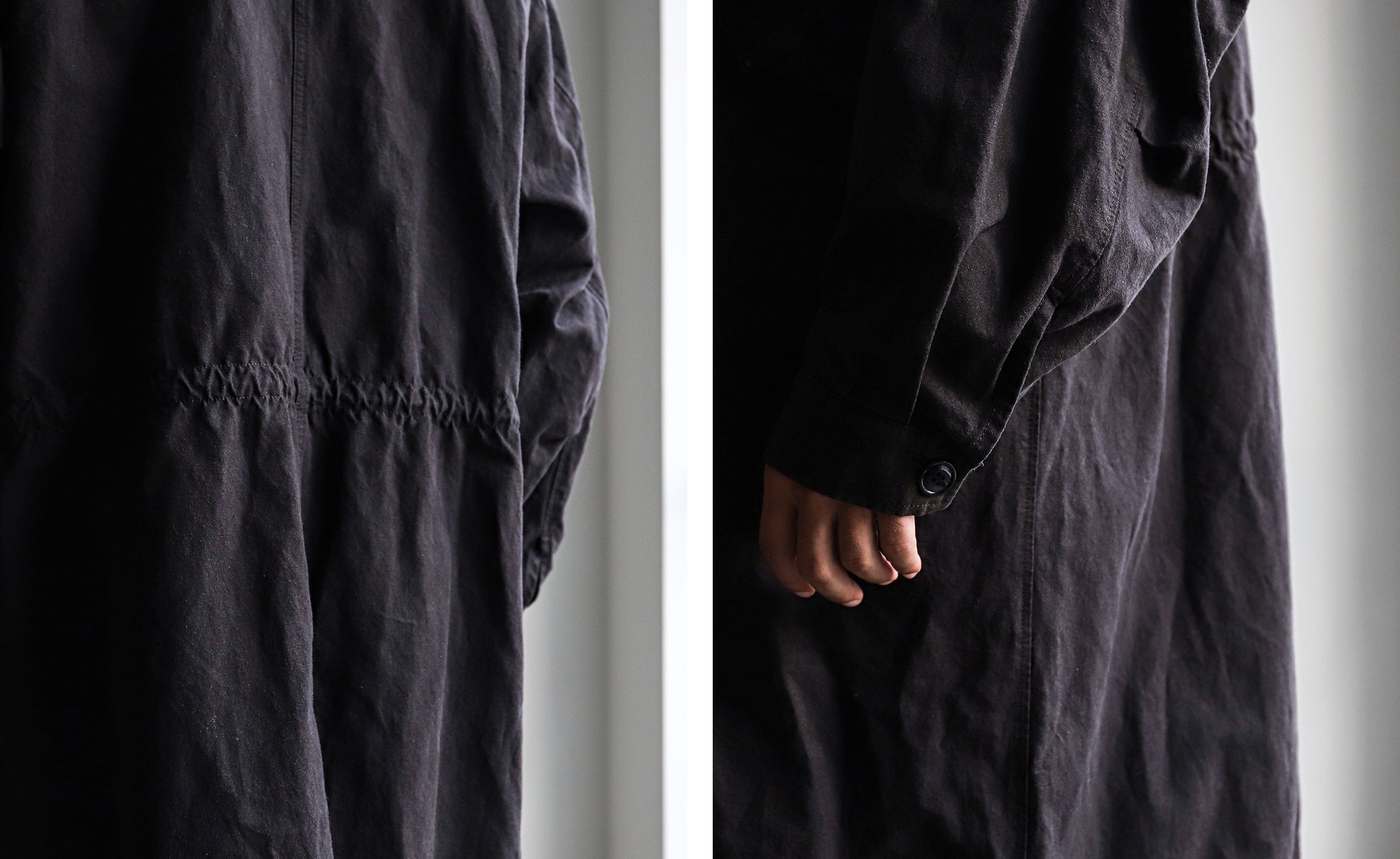 今回の新作モッズコートは、着古していくことで魅⼒が増すことを念頭に素材を選び、⾊は無機質な⿊で染めることで、時代の流れに左右されず着続けられるアウターを⽬指しました。