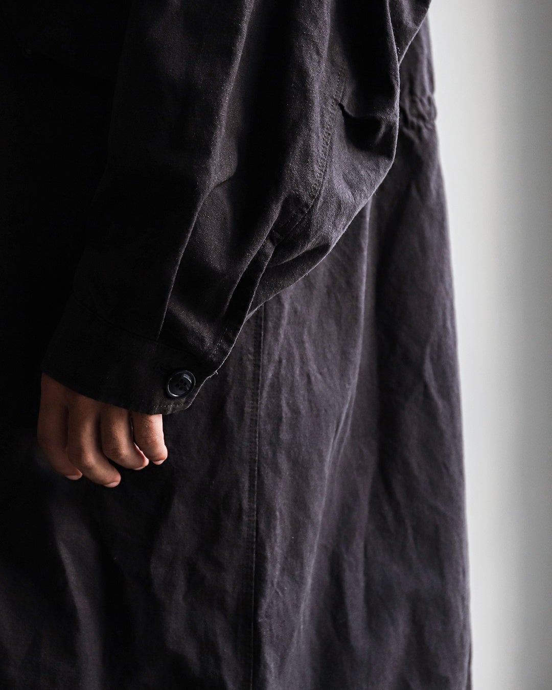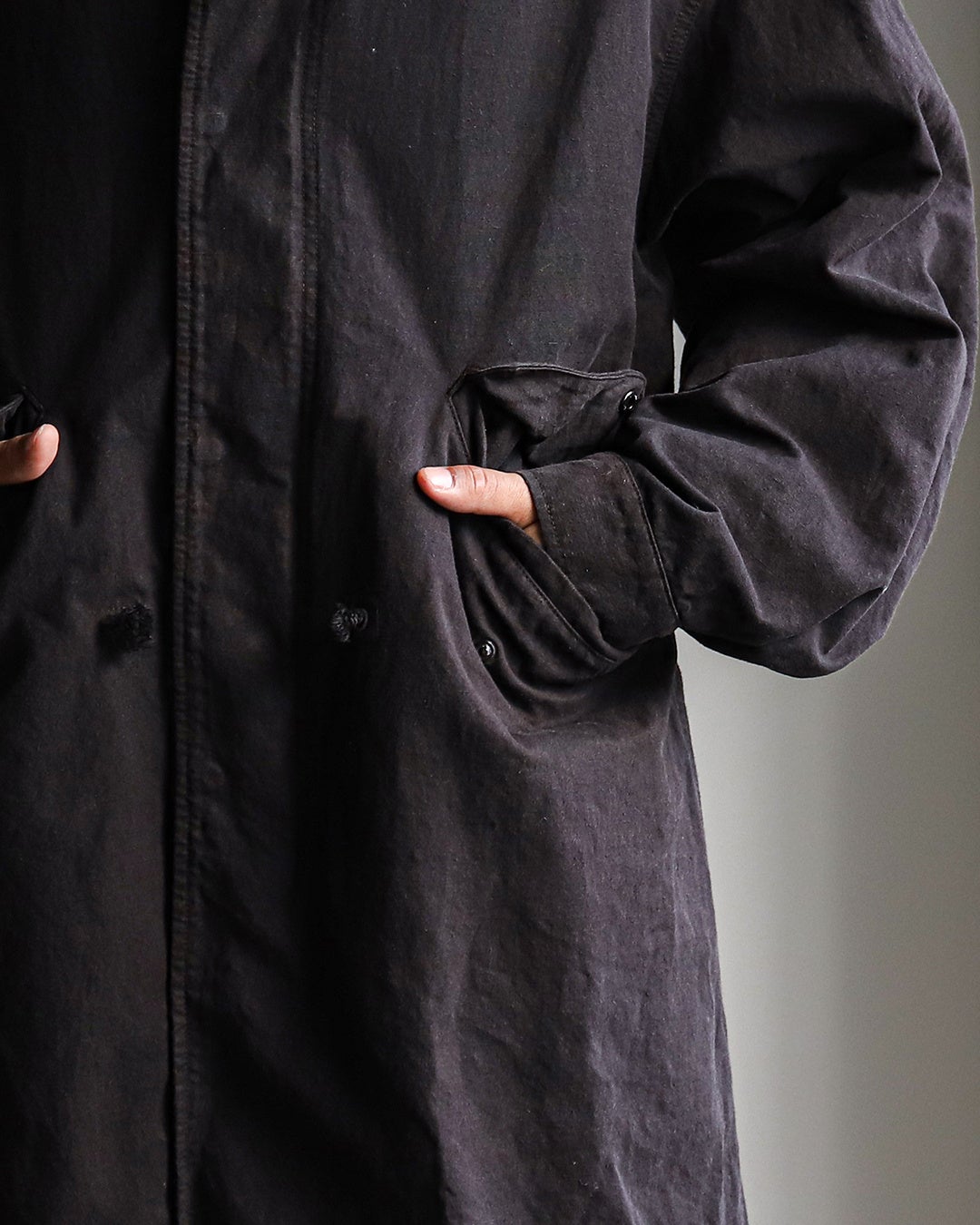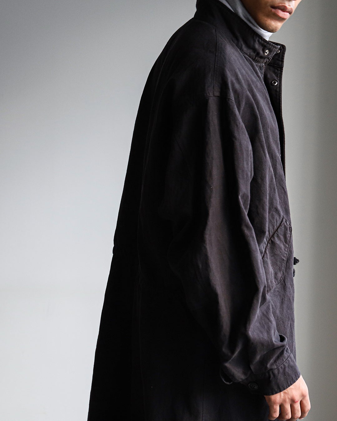 今回の新作モッズコートは、着古していくことで魅⼒が増すことを念頭に素材を選び、⾊は無機質な⿊で染めることで、時代の流れに左右されず着続けられるアウターを⽬指しました。