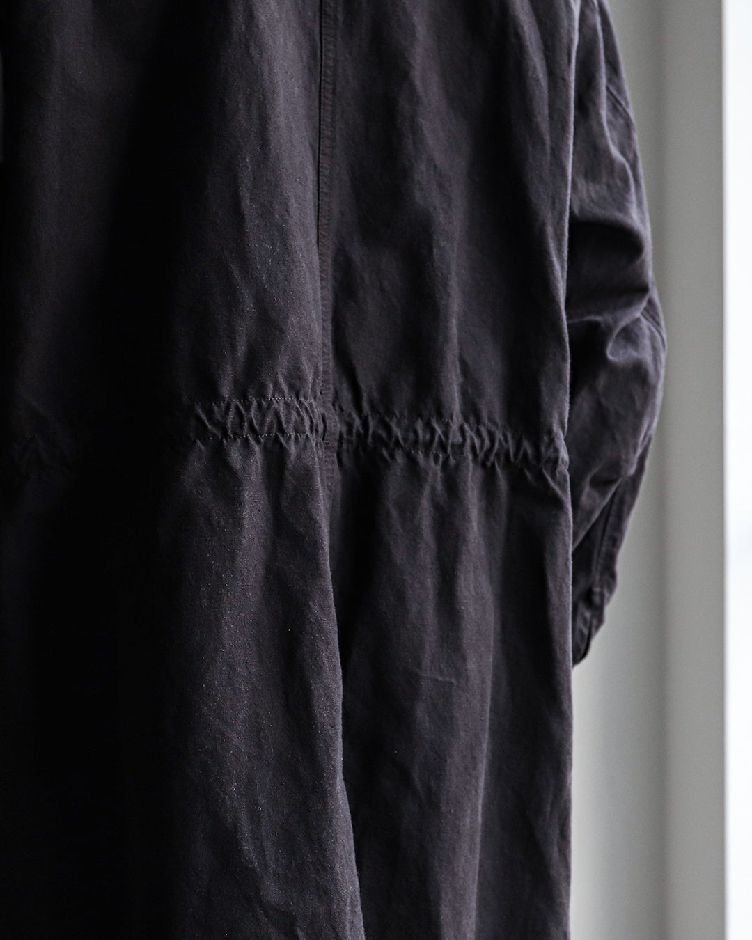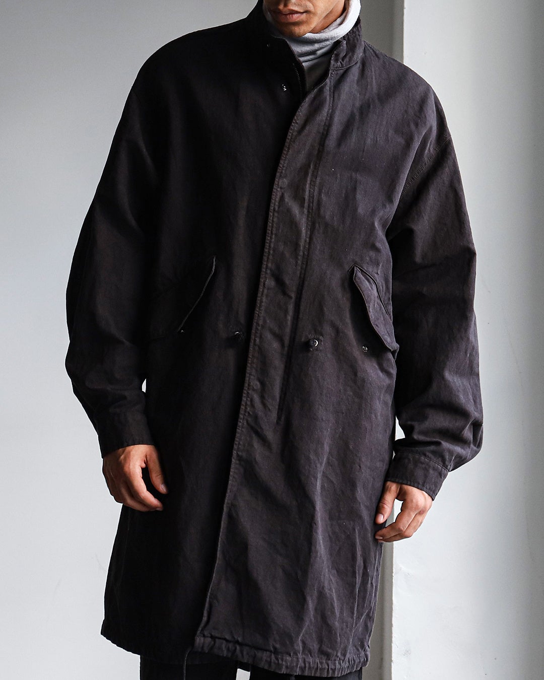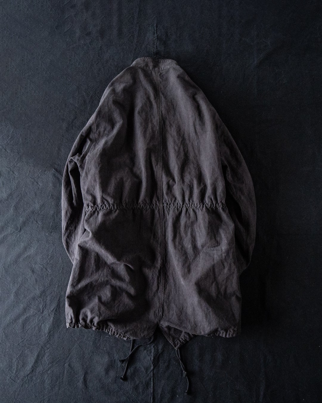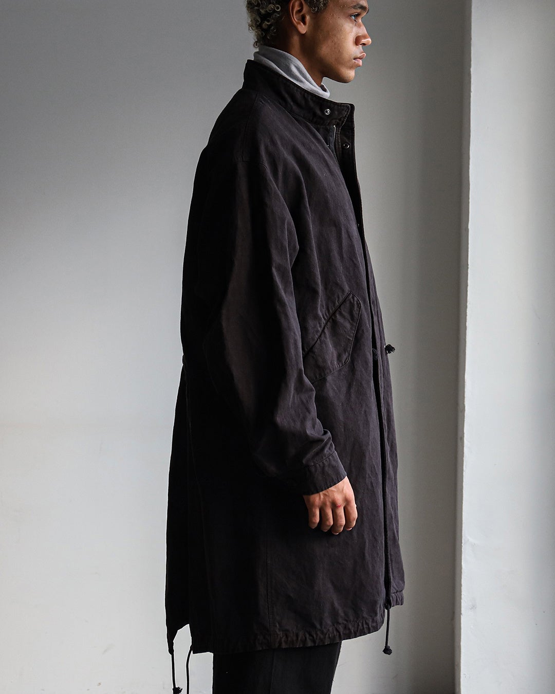 今回の新作モッズコートは、着古していくことで魅⼒が増すことを念頭に素材を選び、⾊は無機質な⿊で染めることで、時代の流れに左右されず着続けられるアウターを⽬指しました。