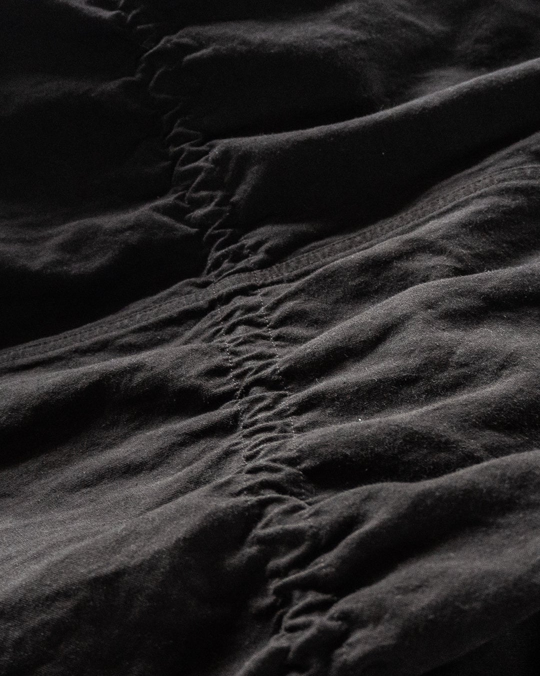 仕⽴てた後に、⼀着丸ごと染め上げる製品染め。動きのある天然繊維だからこそ、濃淡や陰影がある仕上がりになっています。