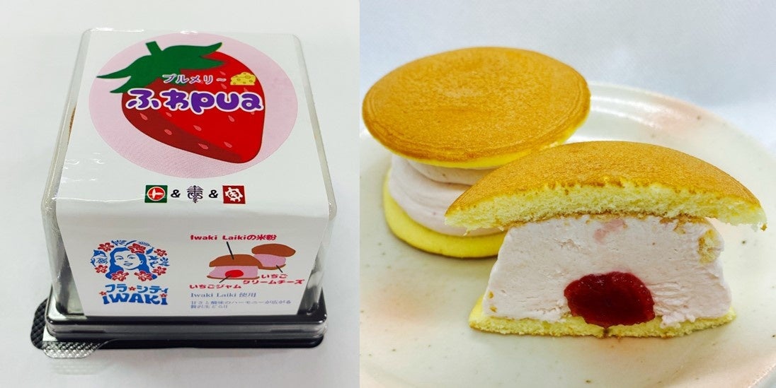 (3) 商品特徴:ストロベリーソースを特製クリームで包み、Iwaki Laikiを入れた生どら焼きの生地で挟みました。ふわふわの生地の食感とストロベリーとクリームチーズの相性が抜群の贅沢な逸品に仕上がりました。
