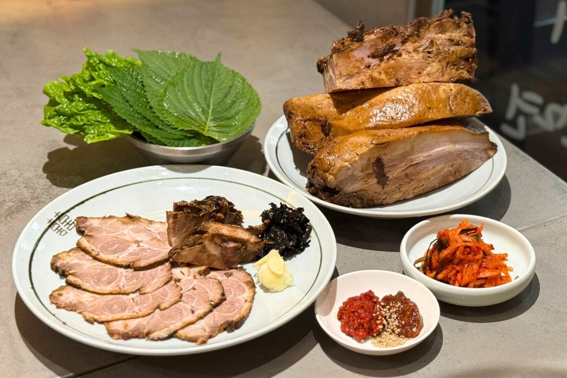 ディナー限定で提供する “黒ポッサム”(150gから注文可能 1,650円 (税込)~)は、従来の塩ゆでポッサムを大胆に進化させた革新的な一品です。岩手県産SPF豚「岩中豚」の贅沢な塊肉を、甘口醤油と中国醤油をブレンドした黒い特製ダレに一晩漬け込み、じっくりと蒸し上げています。