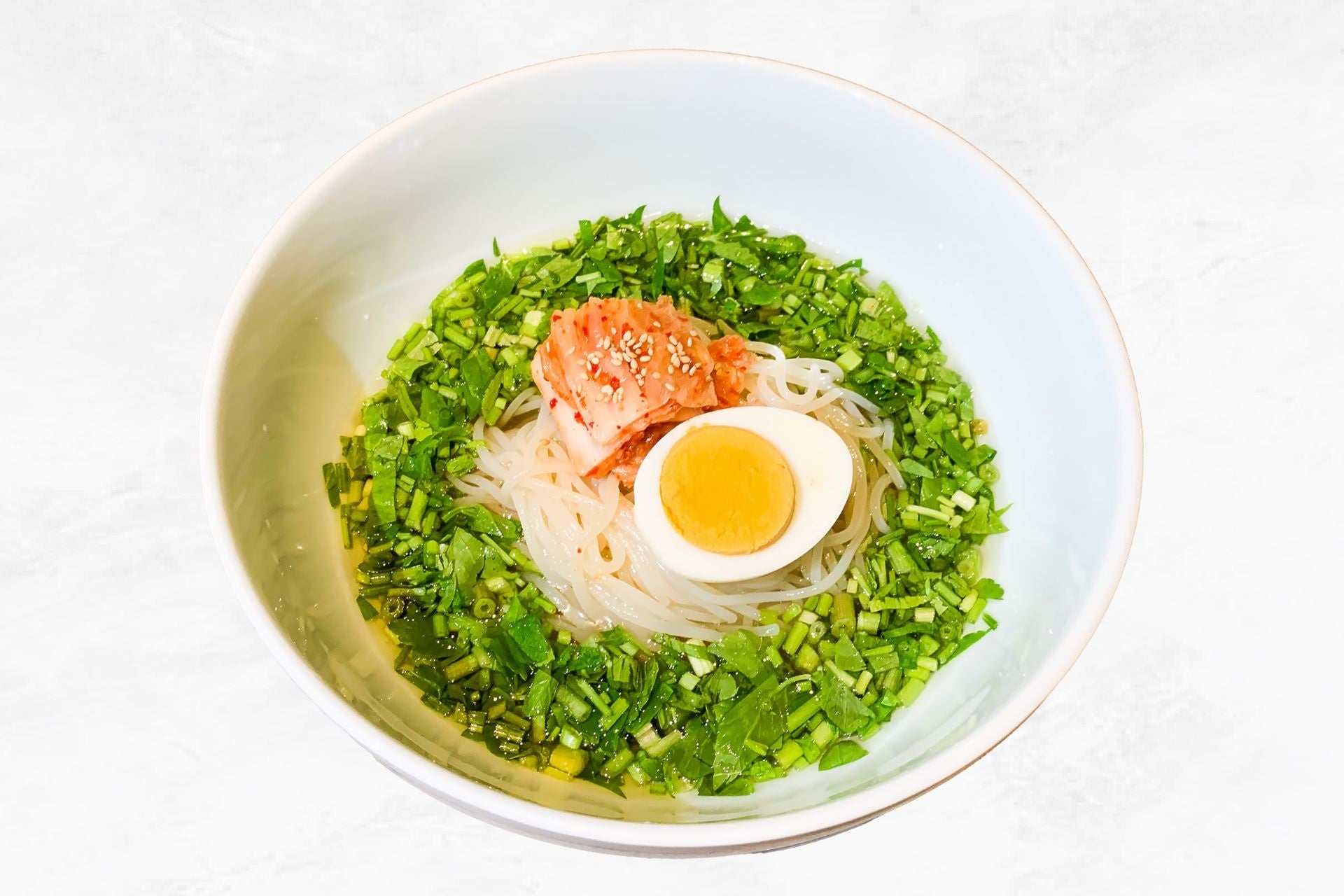 目を奪う山盛りミナリが主役の冷麺。
