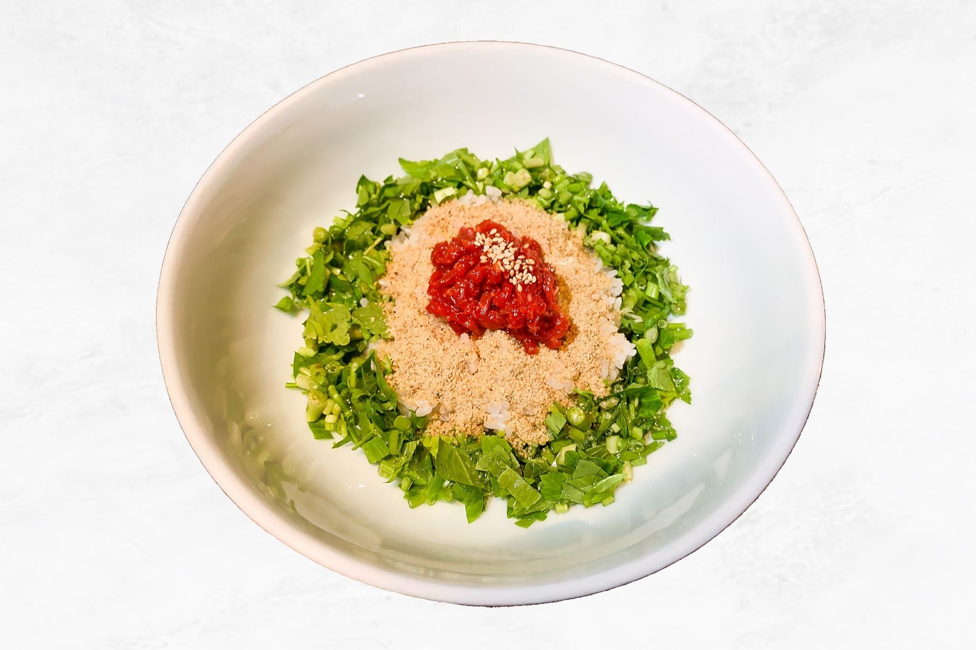 山盛りのミナリに甘辛ユッケ、自家製ダレ、国産えごまパウダーを組み合わせた「ビビンバ」。ミナリのシャキシャキとした食感と爽やかな香りが温かいごはんと絡み、デトックス効果と満足感を同時に実現するランチタイムにぴったりの一品です。
