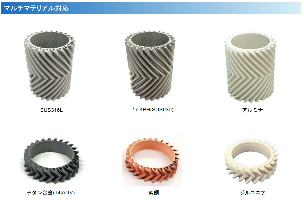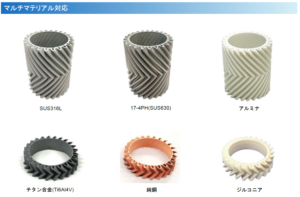 3Dプリンタ向け材料の開発においては、ステンレスやアルミナ材料のほか、焼結に用いられるチタン合金(Ti64)や銅など幅広い多種材料(マルチマテリアル)への対応が可能です。