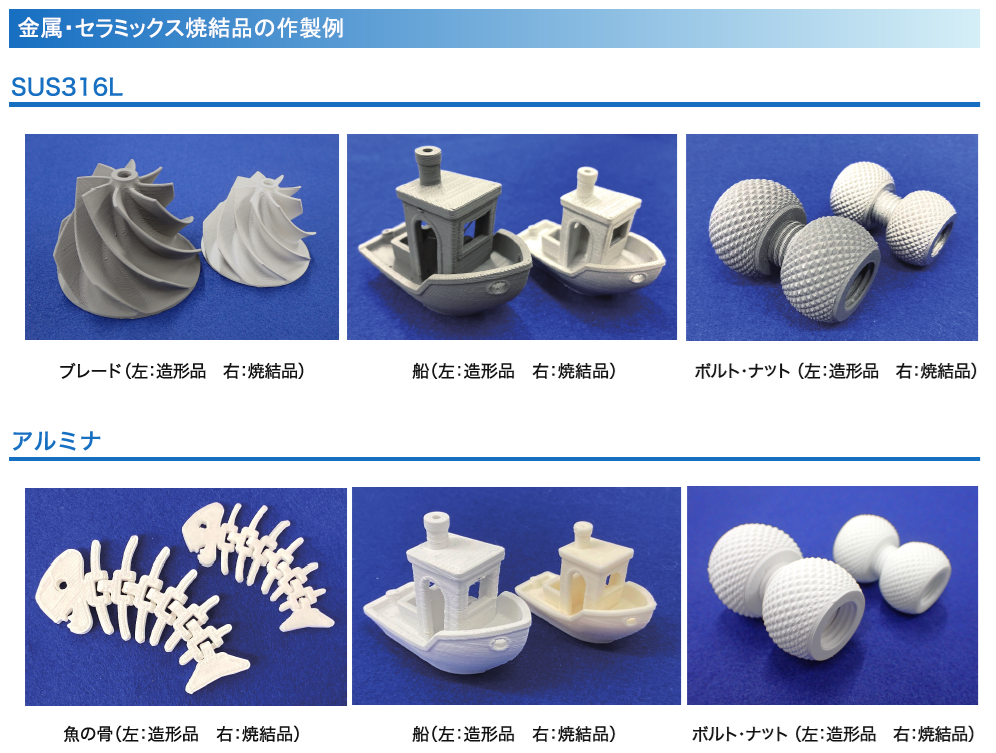 また、複雑形状や内部の空洞化など従来の技術では難しかった特殊形状の金属・セラミックスの焼結品が得られるため、さまざまな用途での展開が期待されます。