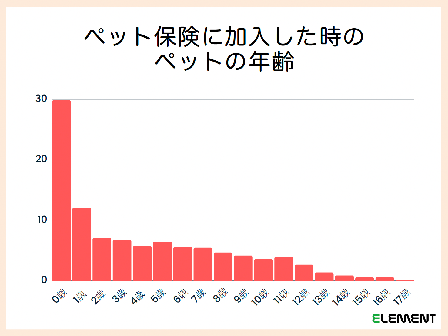 調査結果から、ペット保険に加入する際のペットの年齢は0歳に加入したと答えた人が29.8%と最も多く、次に1歳の時に12%ということが分かりました。つまり、40%以上のペットが0歳〜1歳の時に保険に加入しているという結果が出ました。