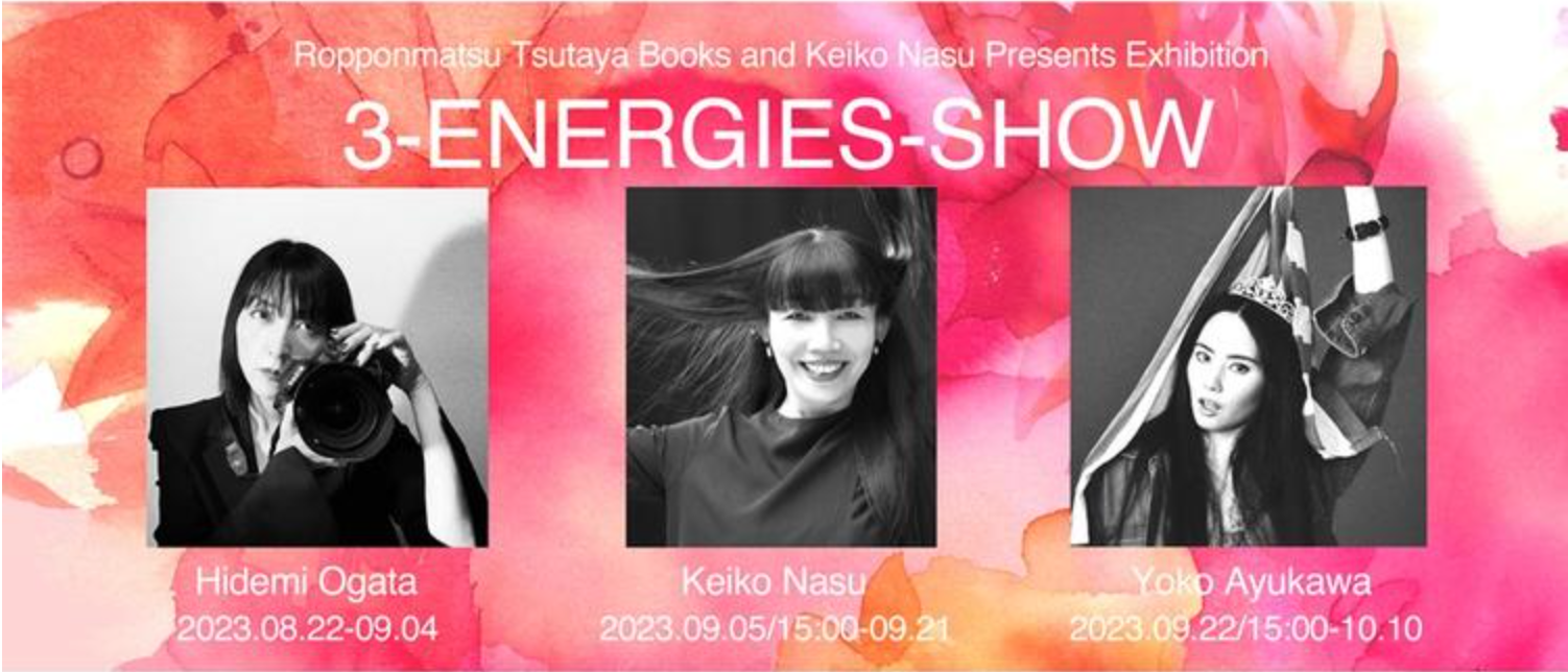 「3-ENERGIES-SHOW」展は、東京を拠点に国内外で活躍する九州出身の作家3人が展示リレーを開催するものです。第一弾は【写真家・緒方秀美】、第二弾は【画家/イラストレーター・那須慶子】、第三弾は【画家/モデル/DJ・鮎川陽子】が展示を行います。