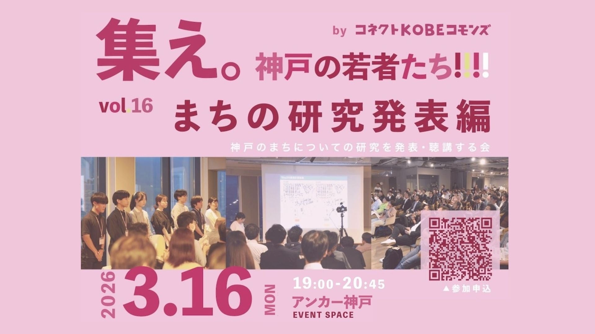 神戸には23の大学・短大があり、約7万人もの学生が学んでいて、その中で神戸をテーマとした研究もあるものの、学内での展示・発表や学校毎の卒業制作展でしか発表されず、まちの人へまでは届いておらずもったいない、まちの人たちに届けたい。そんな想いで、コネクトKOBEコモンズでは2024年度より「まちの研究発表編」を実施。3年目となる今年は3月16日(月)19時00分、アンカー神戸にて開催。神戸のまちで活躍する人と、次世代を担う学生が繋がる機会をつくり、未来に向けた想いを共有します。