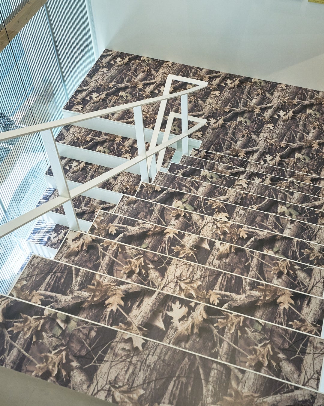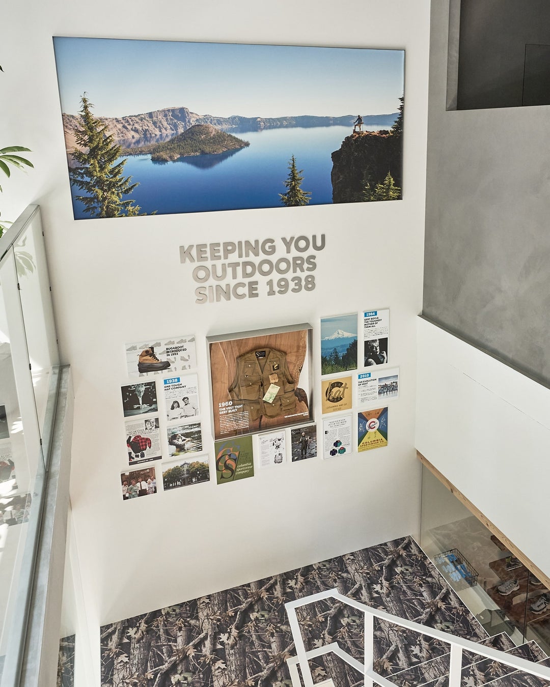 2フロア(396.10㎡)の店内は、白くプレーンな内壁で都会的な印象を与えつつも、コロンビアのプロダクトが持つアイコニックな要素と山や自然の荒々しい要素を組み合わせて、あえて“そのまま”使うことで、ブランドの世界観とプロダクトそのものが印象的に見える空間を目指しました。