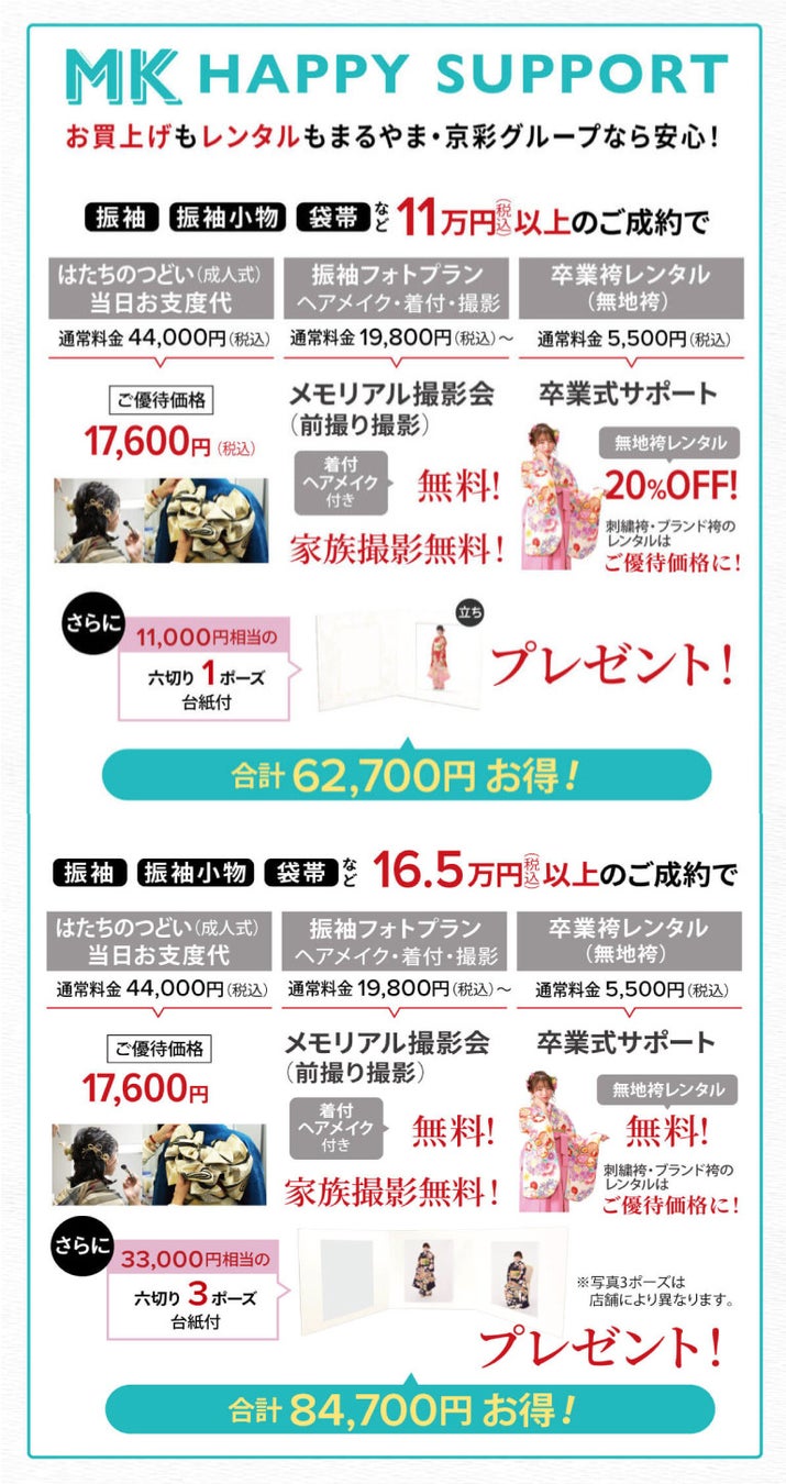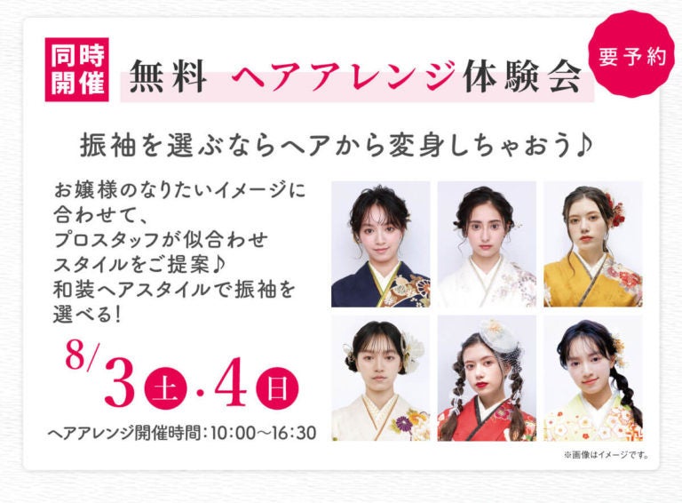 無料ヘアアレンジ体験会、振袖のレンタルからご購入、撮影プランまで振袖企画も満載です。