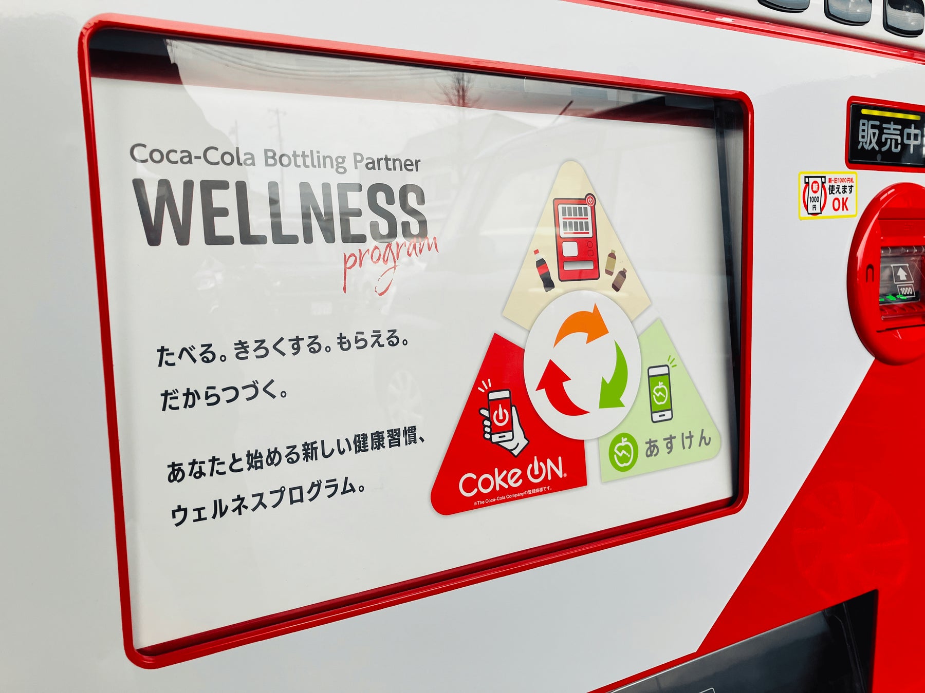 「ウェルネスプログラム」は、コカ・コーラ社の自動販売機を設置した企業が費用無料で導入できる、ヘルスケアアプリ「あすけん」とコカ・コーラ公式アプリ「Coke ON®」*² のドリンクチケットを利用した、お得意さまの健康経営に向けた取り組みをサポートするプログラムです。