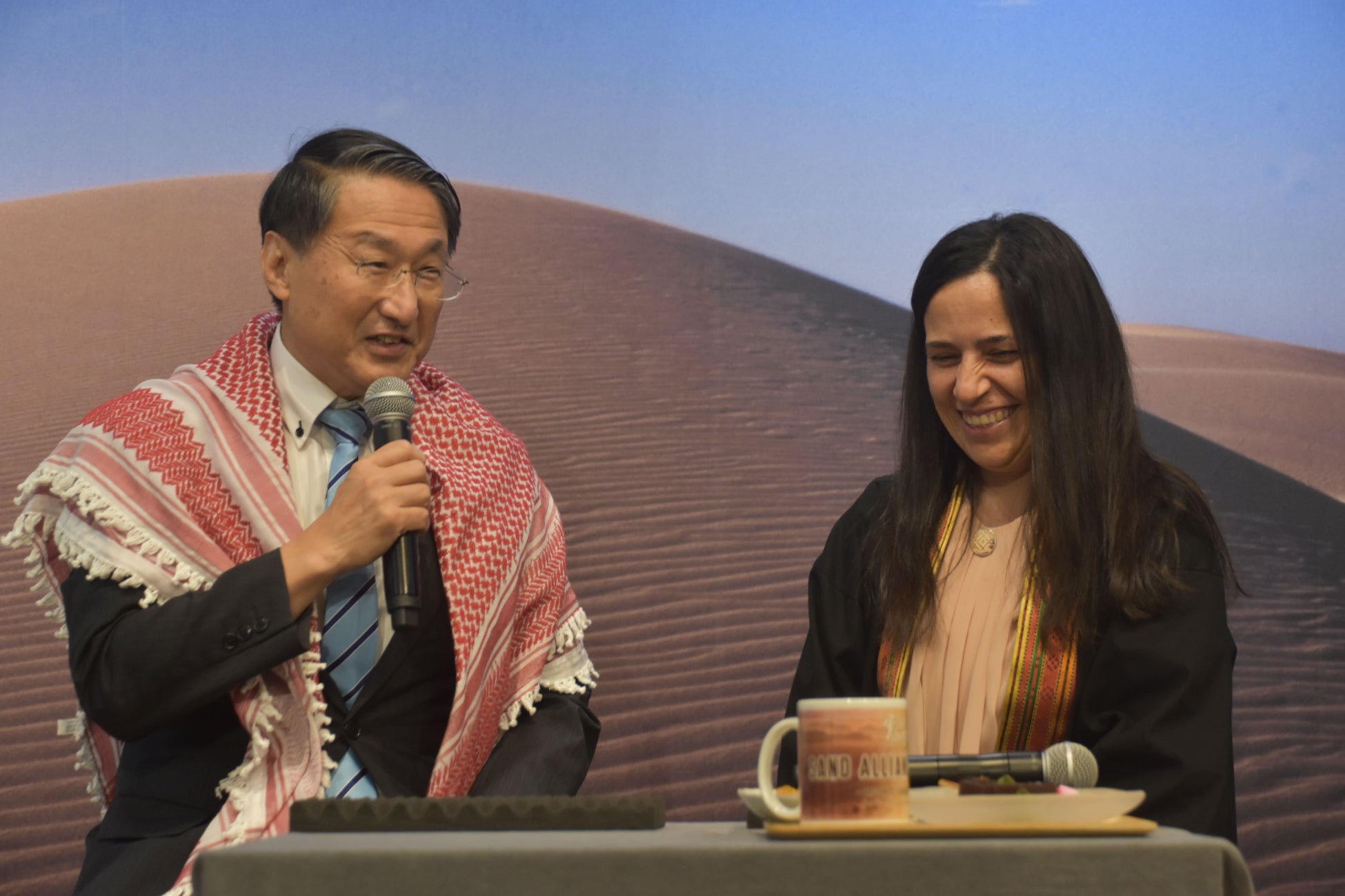 フェアの開始に先駆け、8月7日(木)には平井県知事とヨルダン政府代表代行シファ様が登場し、「鳥取・ヨルダン砂同盟フェア」発表会を執り行いました。鳥取県より「すなば珈琲」の皆様にもお越しいただき、砂を使った焙煎方法の一部を特別に披露いただきました。フェアの開催について平井県知事は「砂同盟の友情で生まれた新しいコーヒーを本日から提供します。サンドアライアンスで生まれた珈琲なので、『あら、いいざんす!』。コーヒーも砂で焙煎すると『いいっすな!』。ぜひ多くの方々に召し上がっていただきたいです。」とコメント。シファ様も「このたび、鳥取県と素晴らしいフレンドシップを結ぶことができたことに感謝しています。砂という共通点から始まったご縁ではありますが、今後はマンガや観光といった新たな分野でも、鳥取県とヨルダンの交流がさらに深まっていくことを願っています。両地域の明るい未来を楽しみにしています。」と首都圏の皆様にメッセージを送りました。