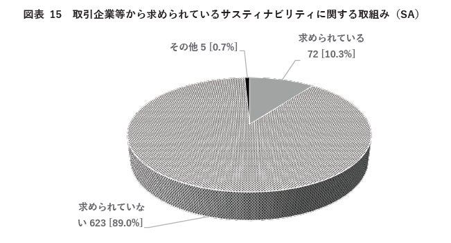 サプライチェーンにおけるサスティナビリティの取組みについては、取引企業等にサスティナビリティに関する取組みを「求めていない」(87.7%)、同様に取引企業等からサスティナビリティに関する取組みに関しても「求められていない」(89.0%)が最も高い。