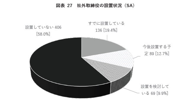 コーポレートガバナンスに関して、社外取締役の設置状況については「すでに設置している」(19.4%)と「今後設置する予定」(12.7%)、さらに「設置を検討している」(9.9%)まで合わせると、約4 割の企業(団体)が社外取締役の設置に前向きな姿勢である。一方、6 割近くの企業(団体)は「設置していない」(58.0%)と回答している。