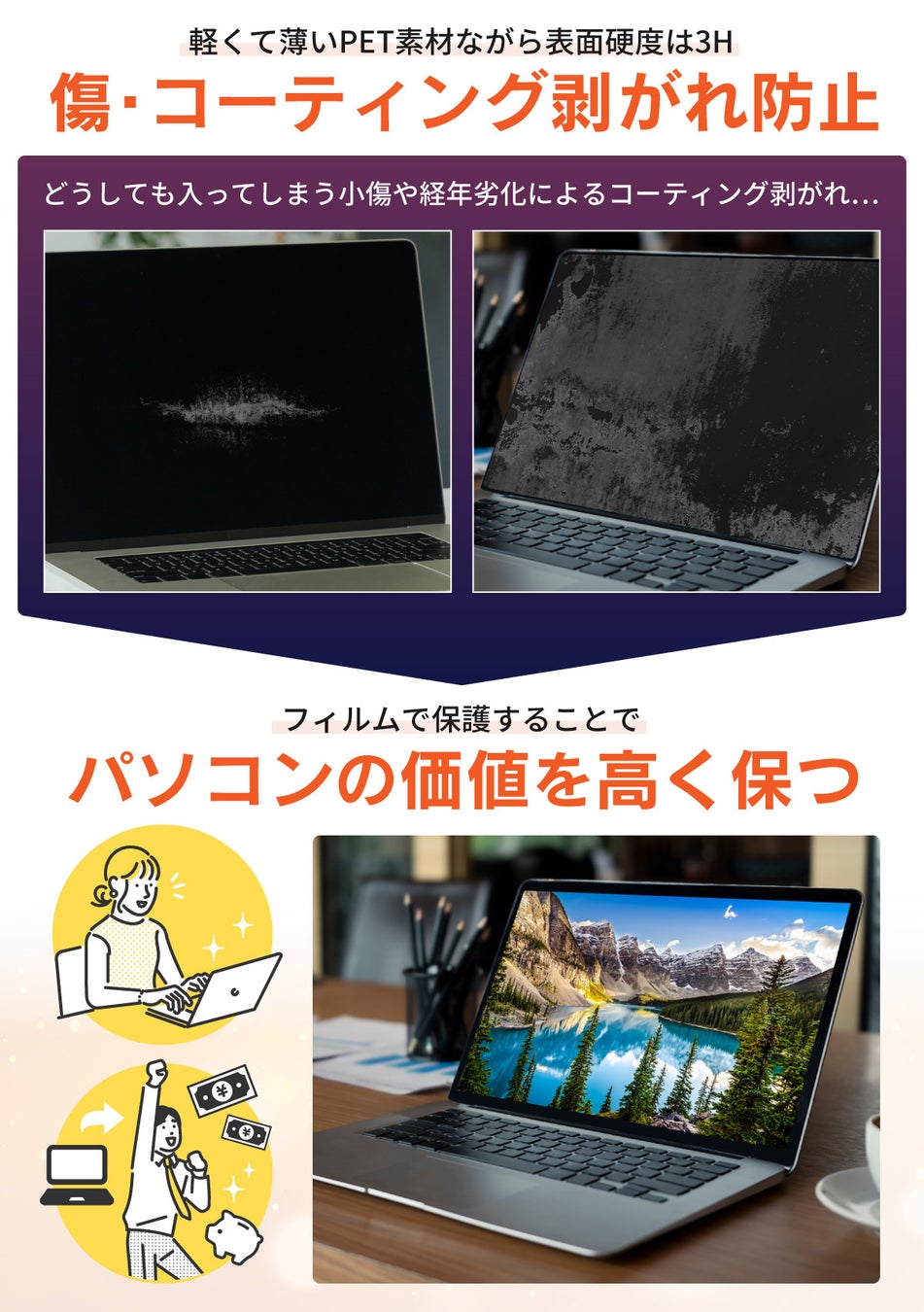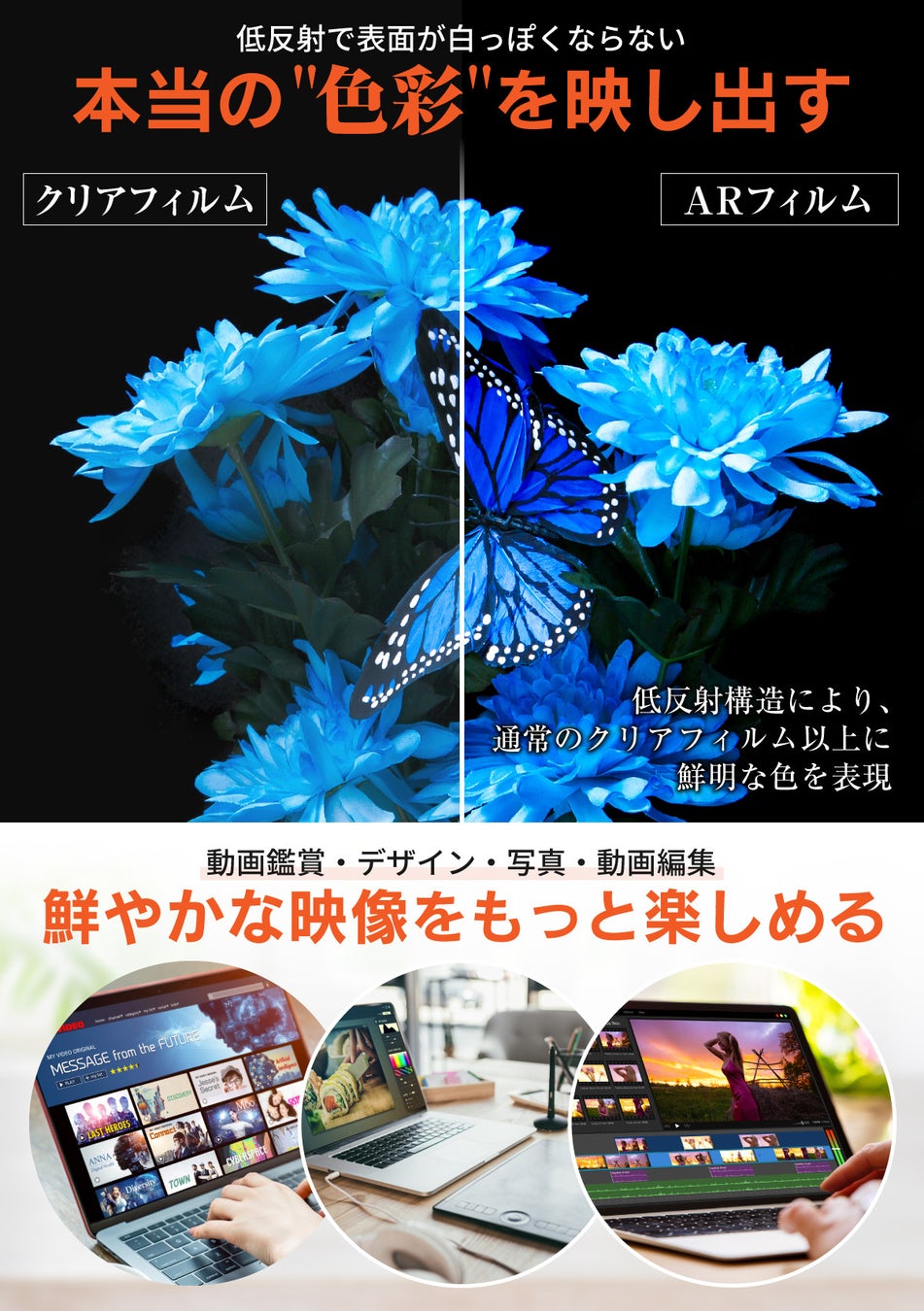 マックブックエアーやマックブックプロの画面傷を防止して、リセール時まで価値を守る!透明感が高く色味がほとんど変化しないので、動画を楽しみたい方、写真編集・画像編集・画像加工をする方ににもおすすめです。