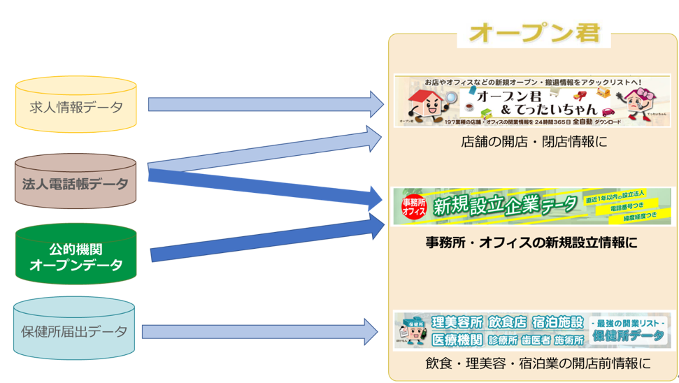「新規設立企業データ 全自動」は、全国の新規設立(直近1年以内)企業情報13.3万件を収録したデータベースです。新規開業、閉業情報の「オープン君」サービスサイトの中から購入できますので、24時間、全自動ですぐにご利用いただけます。