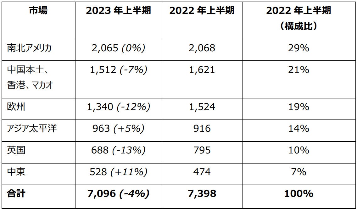 市場別では、依然として南北アメリカが最大市場であり、次いで中国、欧州と続き、全体では前年同期比4%減の販売台数となりました。