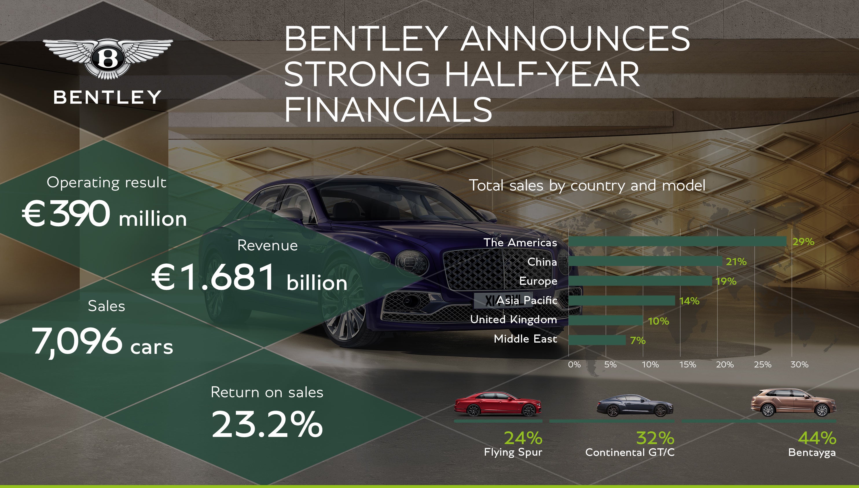 上半期の世界販売台数は7,096台となり、その内訳はベストセラーのラグジュアリーSUV「ベンテイガ」が44%、最新セダンの「フライングスパー」が24%、グランドツアラーの「コンチネンタルGT」と「コンチネンタルGTC」が合わせて32%でした。