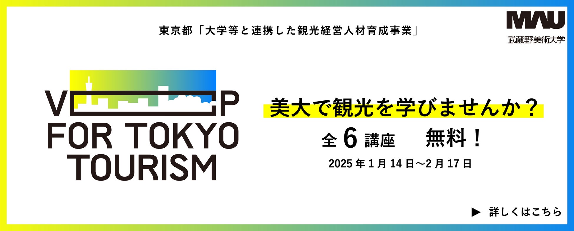 東京都では、観光関連事業者の経営力向上を図り、観光産業の活性化につなげることを目的として、大学等と連携して観光関連事業に従事する者等に向けた新たな教育プログラムの開発等の支援事業を実施しています。武蔵野美術大学は2024年度より連携大学に選定されています。