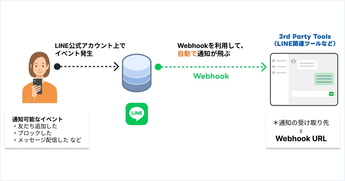 LINE公式アカウントの拡張ツールの多くは、Webhookを受信することで、ツールからのメッセージ配信やチャット応対などができるようになっています。