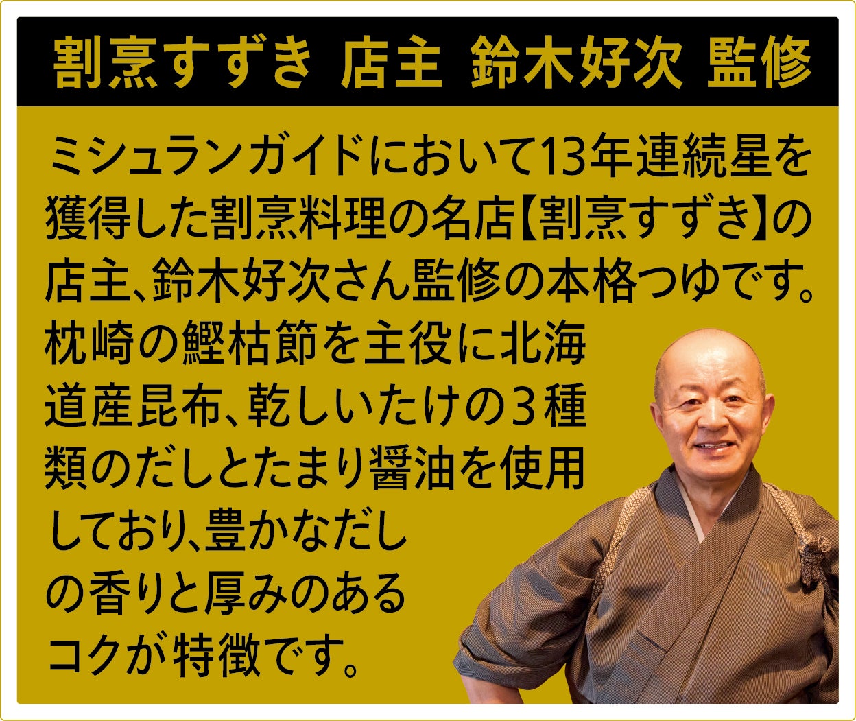 本品は、ミシュランガイドにおいて13 年連続星を獲得した割烹料理の名店「割烹すずき」の店主、鈴木好次さんに監修いただき作り上げた本格つゆです。