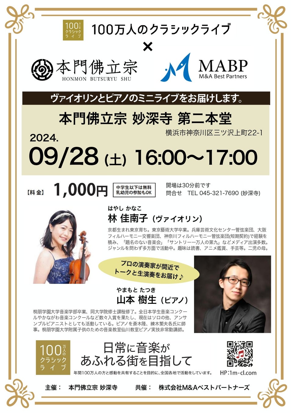 【M&Aベストパートナーズ×100万人のクラシックライブ】9月28日(土)に本門佛立宗 妙深寺にて、クラシックライブを開催!
