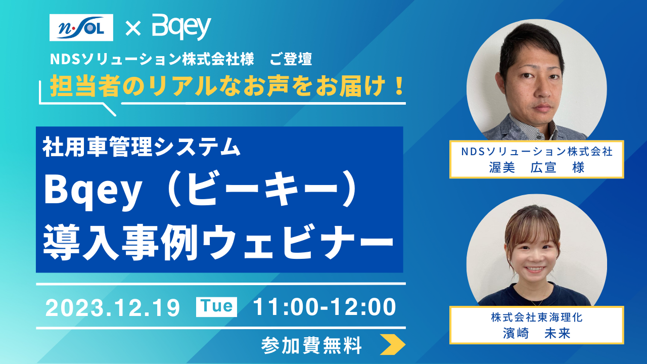 株式会社東海理化は、12月19日(火)に社用車管理をまるっと解決する「Bqey(ビーキー)」のウェビナーを開催します。社用車管理システムの需要が高まるなか、システムの導入を検討している企業から、「どのような企業が導入しているか知りたい」「自社に近い導入企業がどのように効果を上げているか知りたい」などの声をよく耳にします。そこで今回はお客様の「リアルな声」をお伝えするウェビナーを開催いたします。Bqeyを導入されたNDSソリューション株式会社をゲストに迎え、導入検討から導入後の効果、Bqeyの強みであるデジタルキーの使用感について本音でお答えいただきます。皆さまのご参加を心よりお待ちしております。