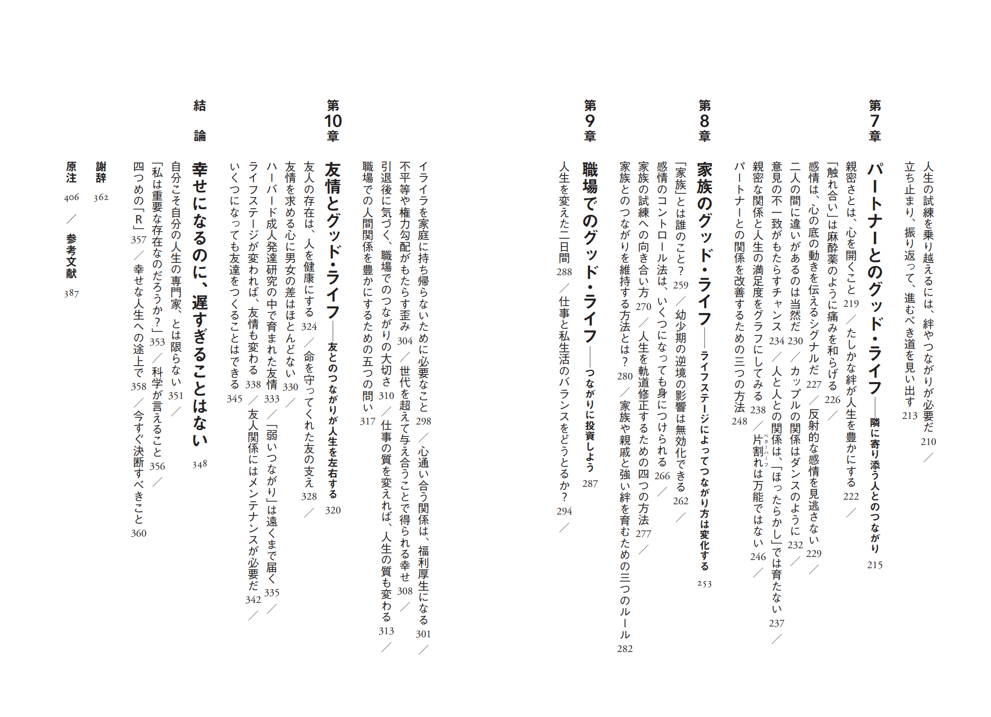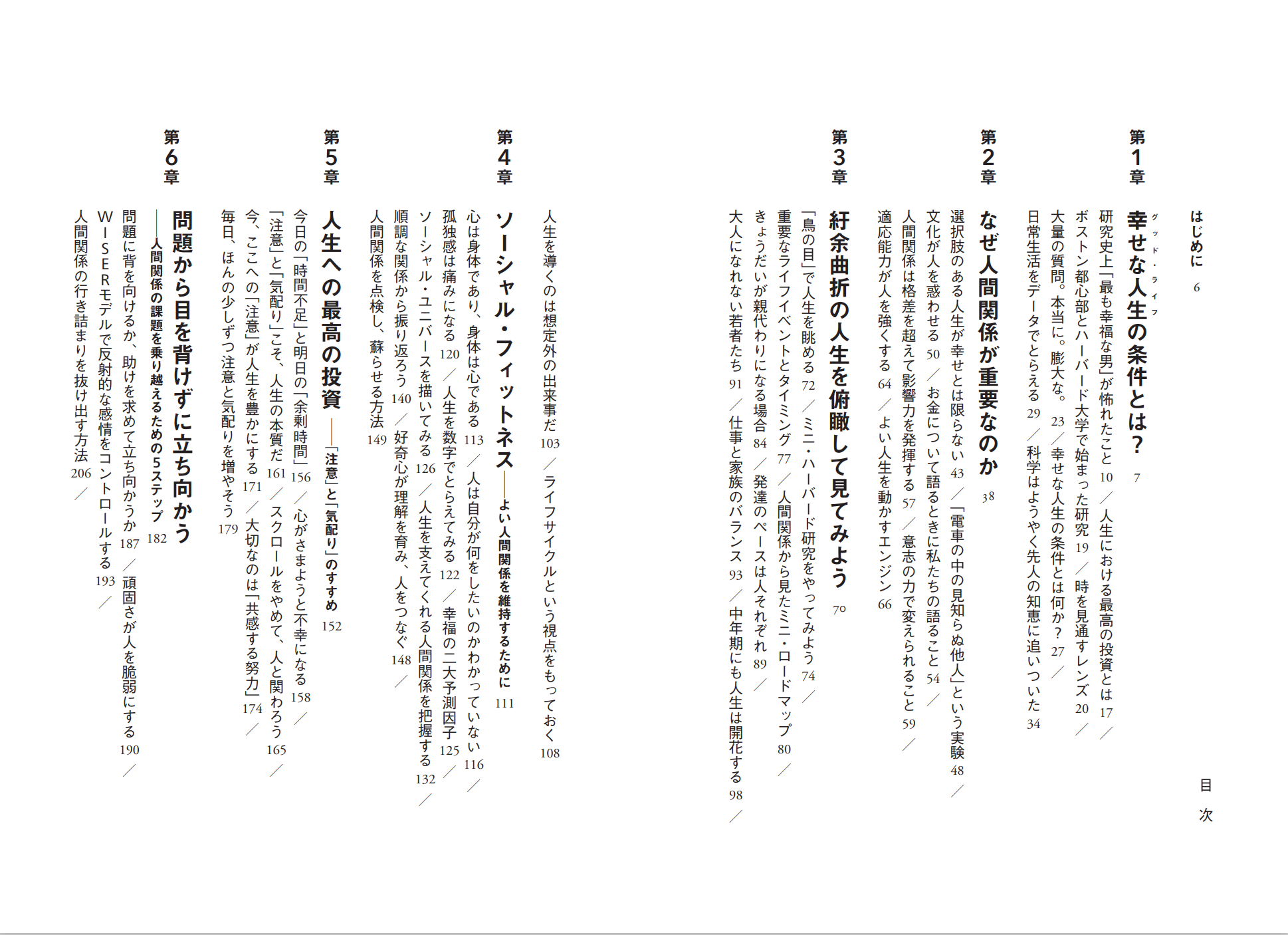 本書はこれまでに被験者として協力した2000人以上の人生をもとに、“幸せは人生とは何か”また“なぜよい人間関係が必要なのか”、そして“どのように人間関係を築いていくべきなのか”までを丁寧に解説している。