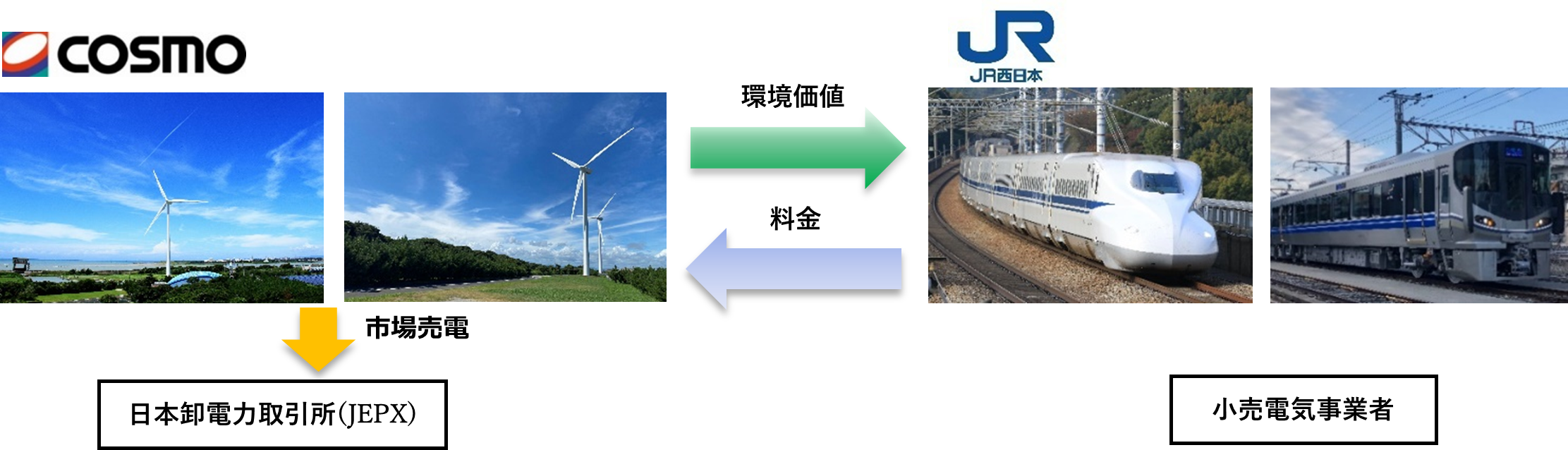 コスモエネルギーホールディングス株式会社(代表取締役社長:山田 茂)、コスモエコパワー株式会社(代表取締役社長:野地 雅禎、以下「コスモエコパワー」)、西日本旅客鉄道株式会社(代表取締役社長:長谷川 一明、以下「JR西日本」)は、発電の方法や立地条件等による制約が少ないバーチャルPPA(発電量に応じた環境価値のみを直接購入する契約)を活用し、列車運転など鉄道事業の使用電力に対する再生可能エネルギー電力(以下「再エネ電力」)のさらなる拡大に関する協議を進めていくため、基本合意書を締結しました。