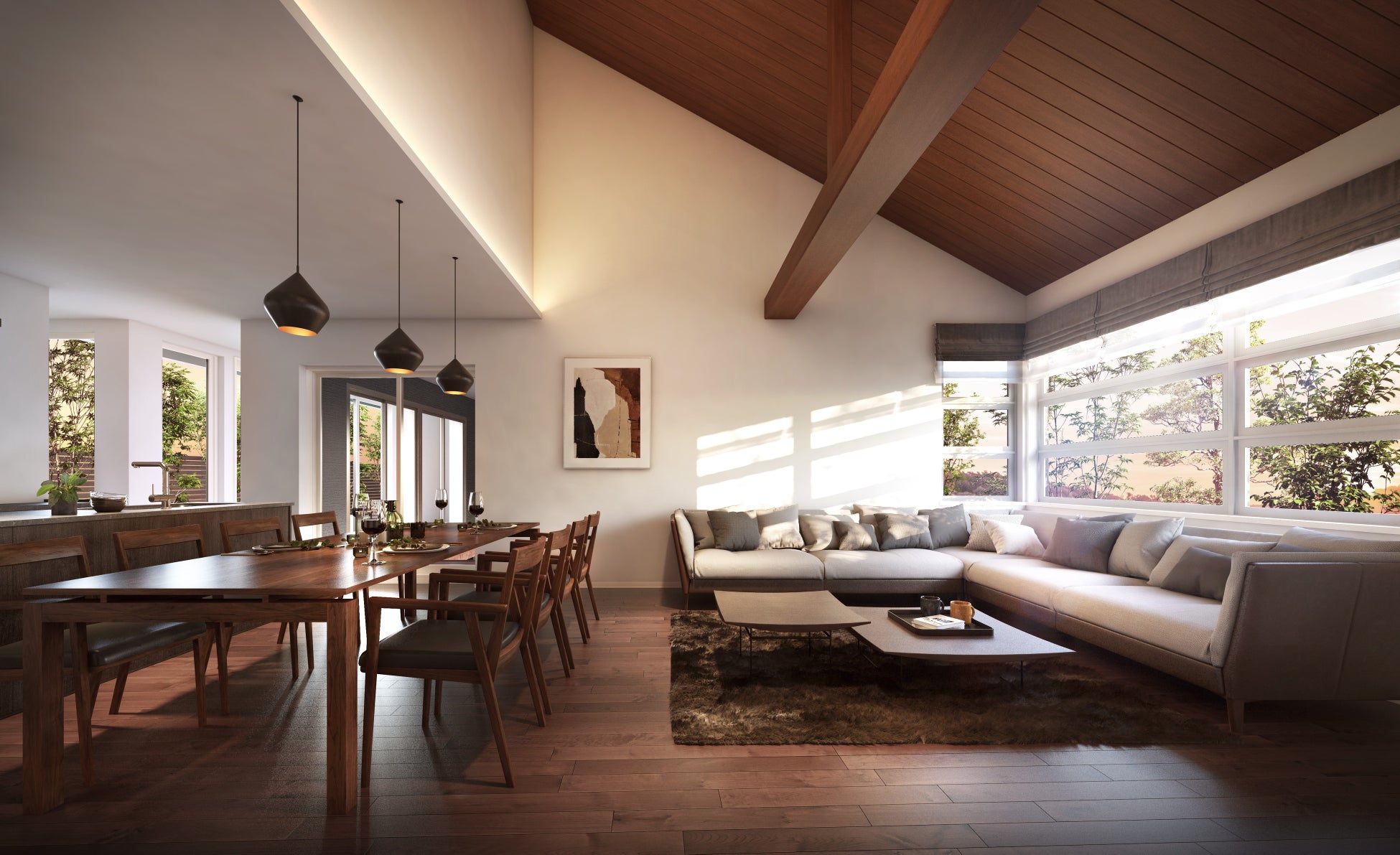 本商品の設計基準である設計ガイドラインは、デザイナーの知見・ノウハウをベースに、平屋の豊かな暮らしを実現するデザイン&プランニング指針として新たに策定。中でも外観スタイルは、存在感のある大屋根のシルエットが異なる2種類をラインアップします。フラット屋根スタイルでは、力強い水平ラインを基調とした工業化住宅ならではの機能美を表現。傾斜屋根スタイルでは、高さのあるダイナミックな勾配天井が縦方向に広がる余白の機能美を演出します。深い軒や大開口は、自然と調和するパッシブデザインを実現しています。