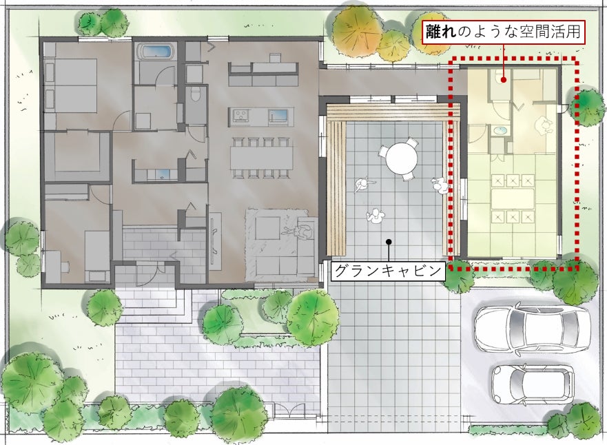 日本建築の「離れ」を想起させる独立した空間により、周囲を気にせず趣味や仕事の時間を過ごすことが可能。ゲストルームとしての利用など、邸宅のような贅沢さを演出します。