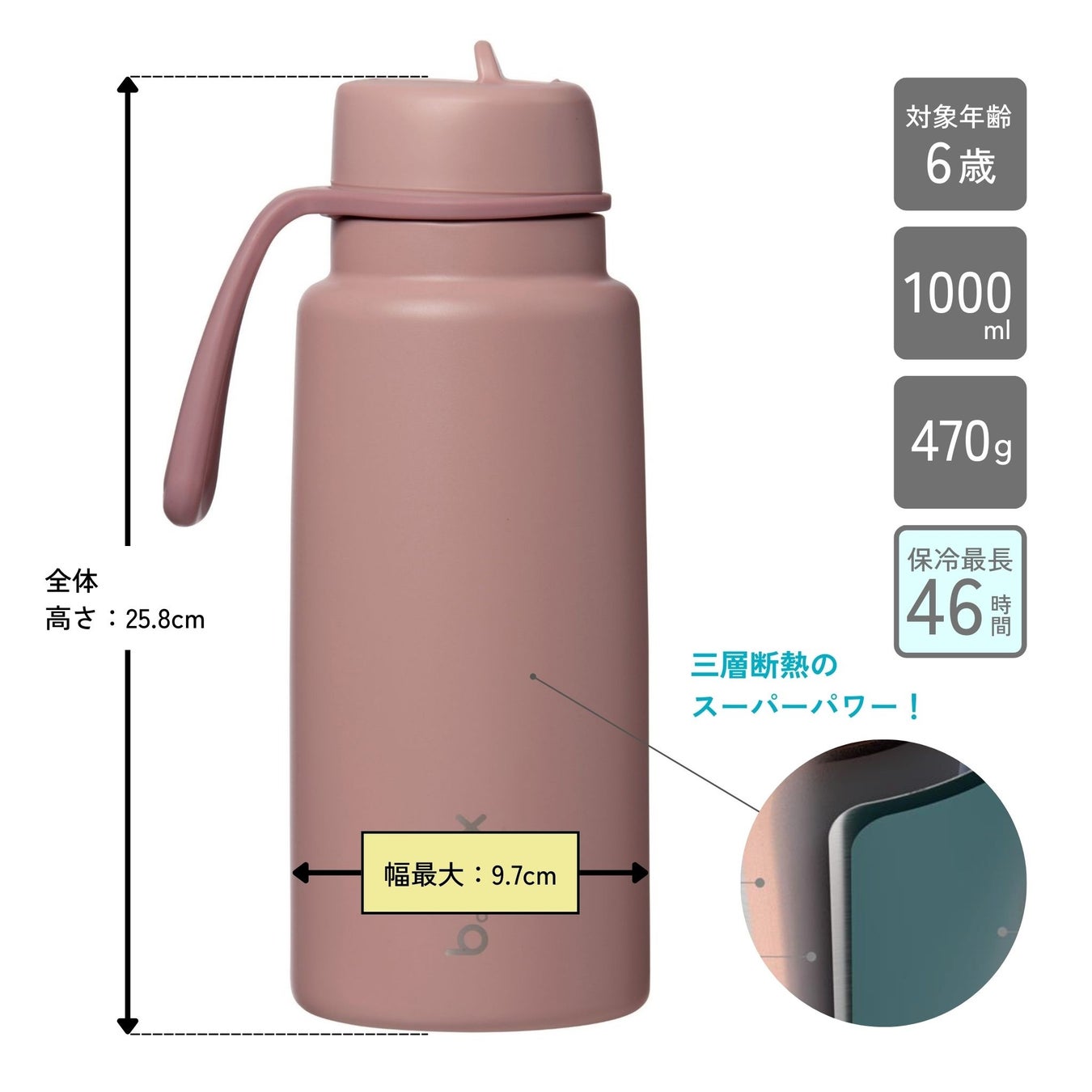 3層断熱のステンレス製ボトルで、お出かけにも便利な保冷保温が可能なドリンクボトル。持ち運びに便利なハンドルと、ワンプッシュで開くボタン式の蓋が特徴です。飲み口は角度がついたストローで、子どもが飲みやすいように作られています。